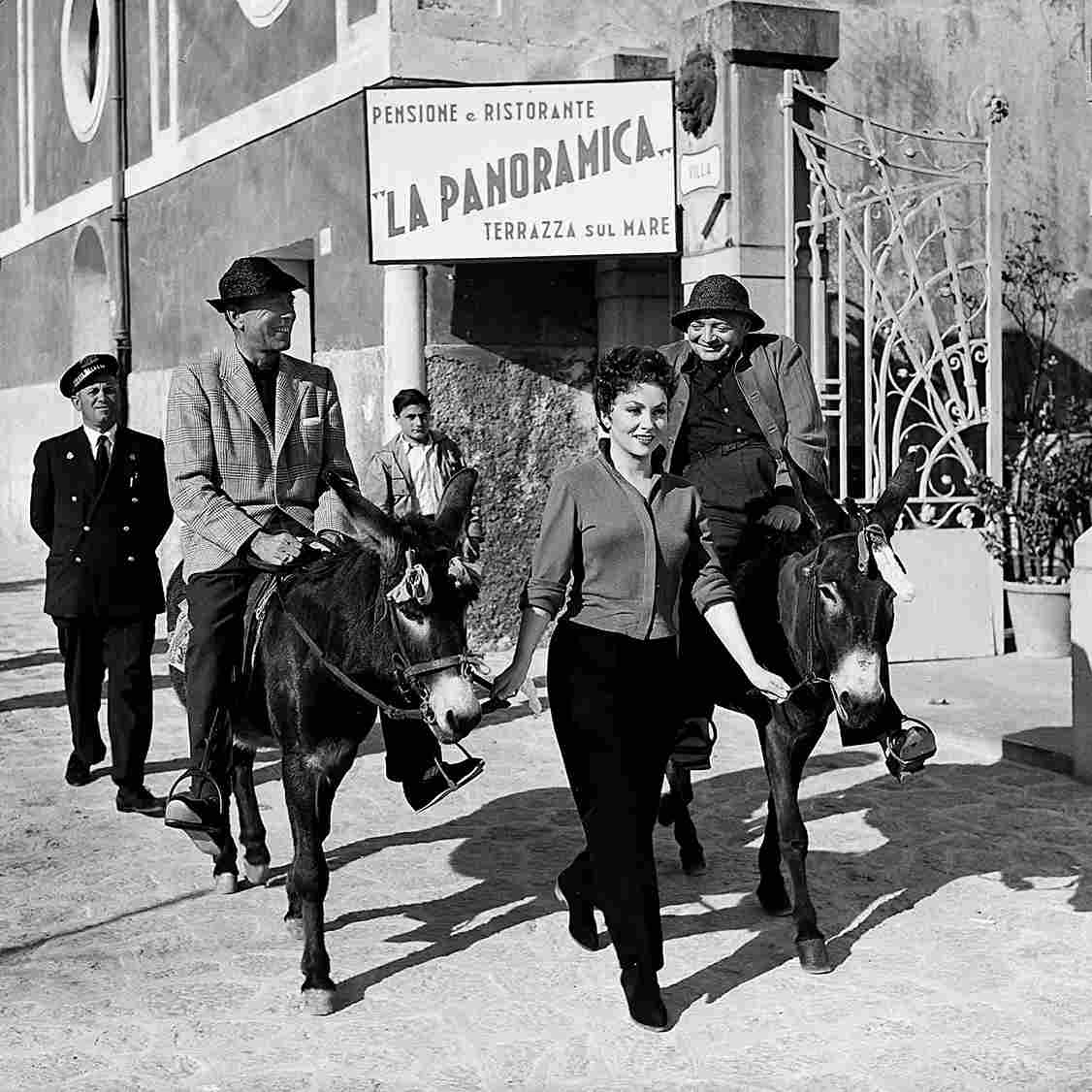 4. Lollobrigida with actors Humphrey Bogart and Peter Lorre along a street in Ravello, Italy in 1953, during a break from filming