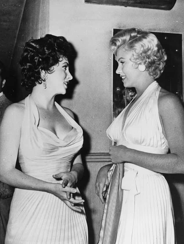 Gina Lollobrigida (pictured left) with American actress Marilyn Monroe (right) in 1954