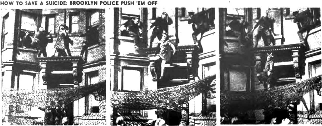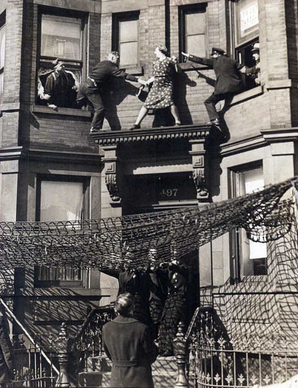 In 1942, Mrs. Egbert, living at 497 Dean Street, New York, stepped out of the window and stood on the ledge of the second floor, threatening to jump. This dramatic act drew the attention of both the police and passersby, who quickly tried to intervene.