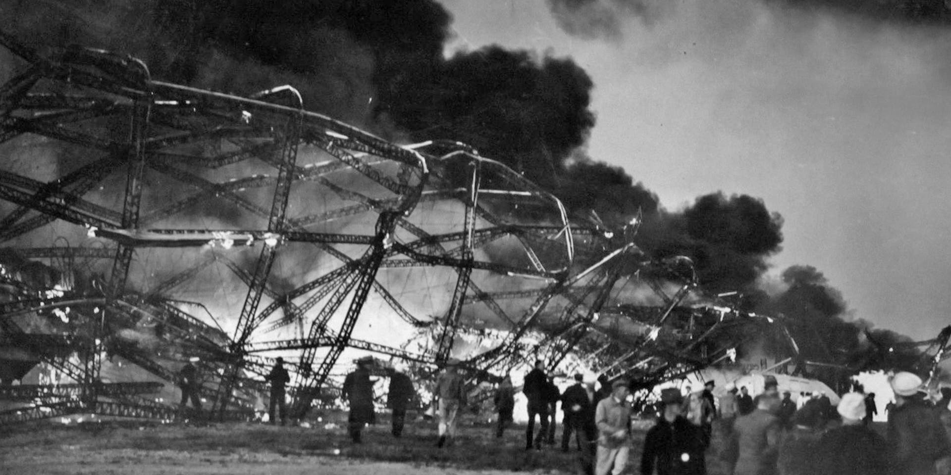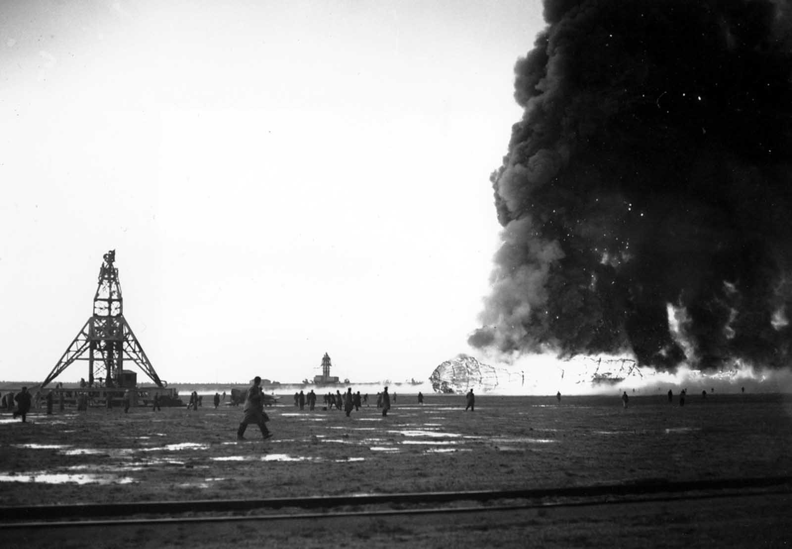 Out of the blue, after a trouble-free voyage, the majestic zeppelin suddenly burst into flames just under 300 feet from the ground.