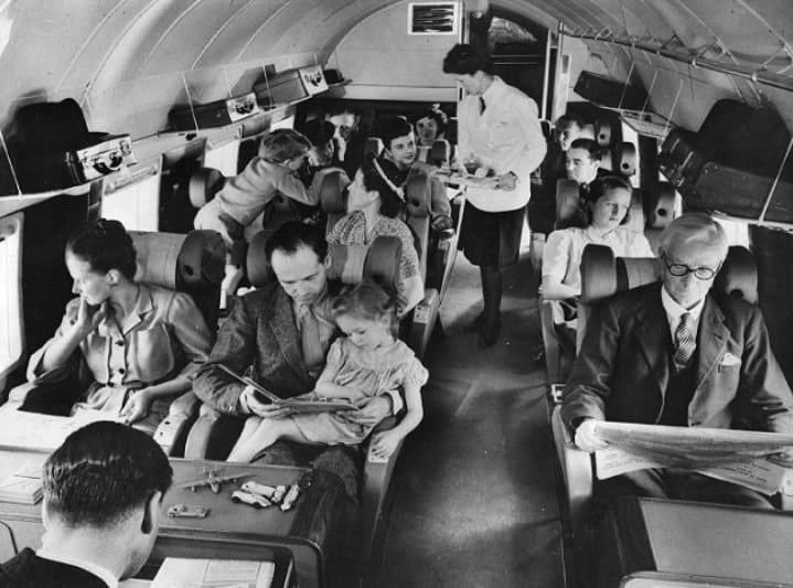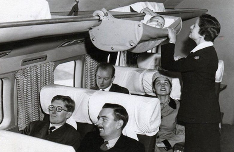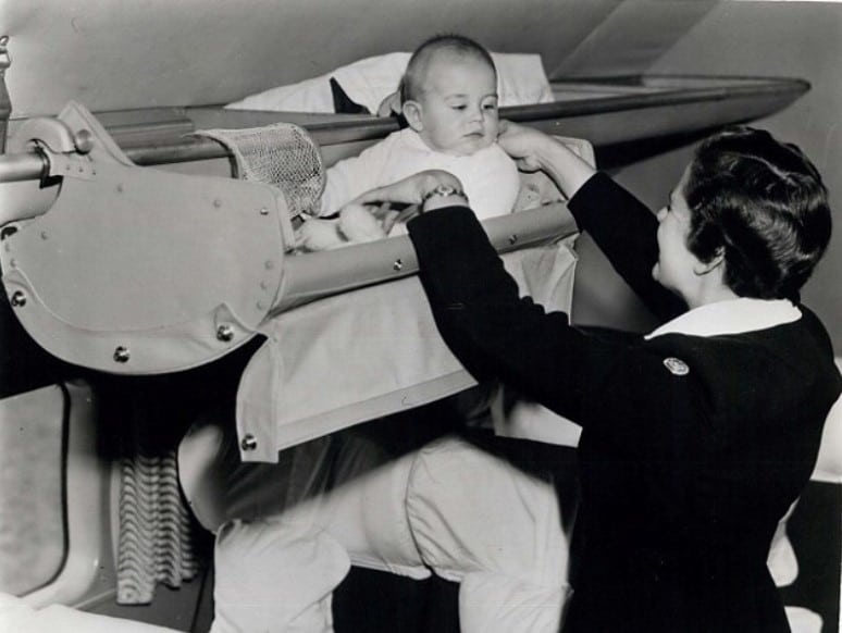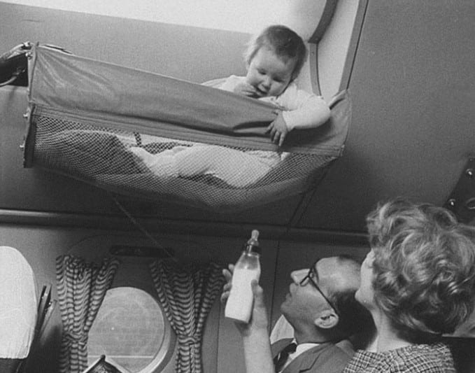Photos from the 1950s reveal well-dressed families on board with babies. In these images, infants were placed in sky cots attached to the overhead bins and were cared for by flight attendants.
