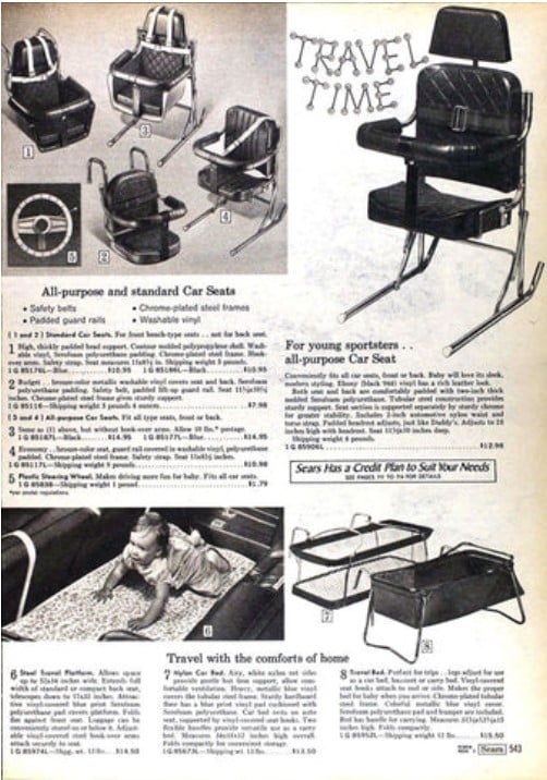 By 1969, safety improvements were still evolving. Sears advertised a “Steel Travel Platform” that year. This device was essentially a steel plate covered with a vinyl foam pad, providing a surface for infants and toddlers to lay, sleep, or play on in the car’s backseat.