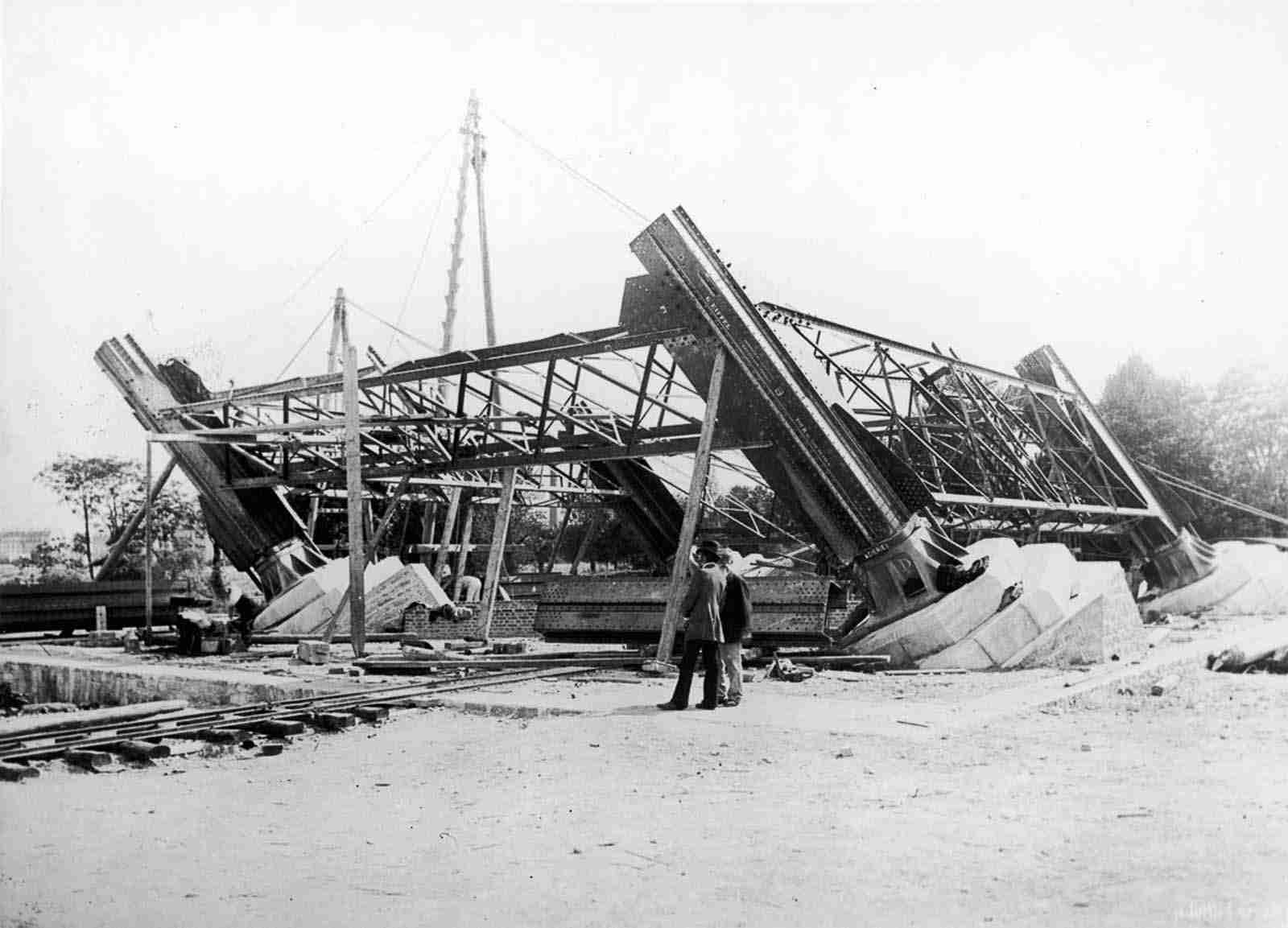 Wooden scaffolding and small steam cranes on the Tower were used for assembly. The first level was built using twelve temporary scaffolds, each 30 meters tall, and four larger ones at 40 meters.