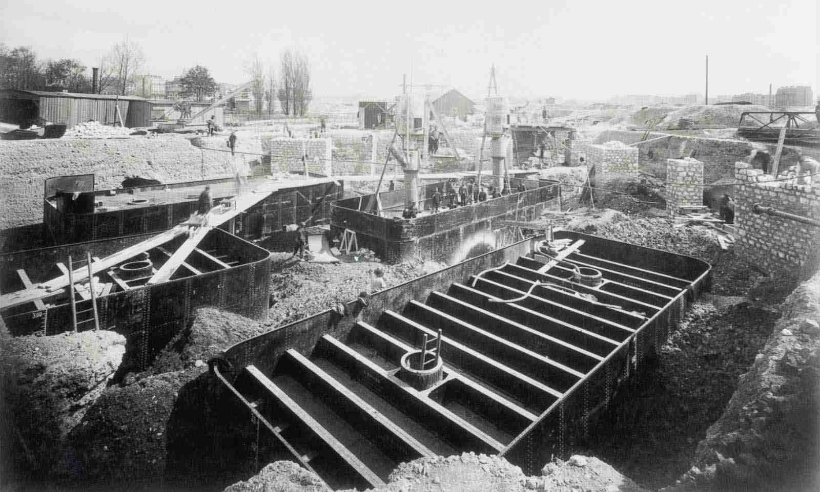 On the Seine side, builders used airtight metal caissons and compressed air to work below water level.