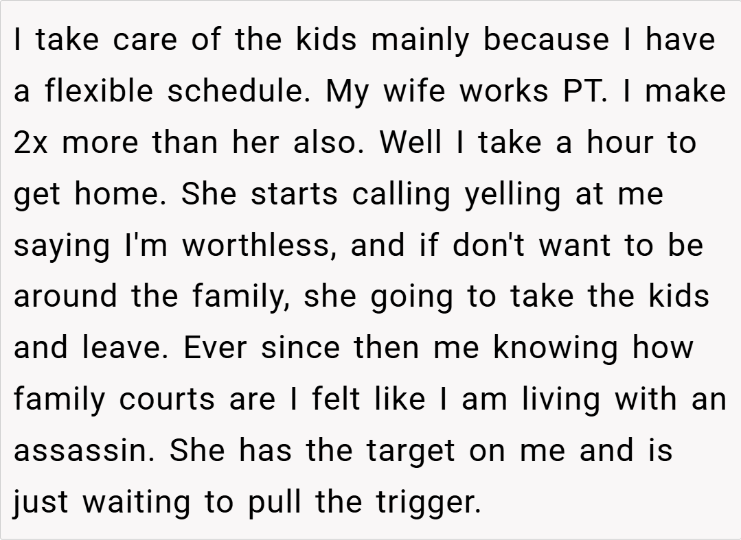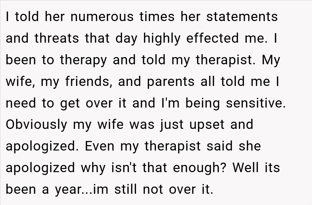 Her angry, demeaning words—calling him worthless and threatening to take the kids away—left him feeling deeply wounded and unsafe in his own home. Now, even a year later, those words continue to haunt him. Despite therapy and repeated apologies, he finds it impossible to be in the same room with her without feeling as if he’s living with an assassin.