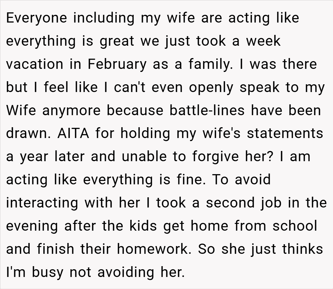 To avoid confronting the painful memories, he even took on a second job in the evenings. With his friends and family urging him to let it go, he now wonders if he’s being unreasonable for holding onto this emotional burden. Is he the asshole for still being unable to forgive her?