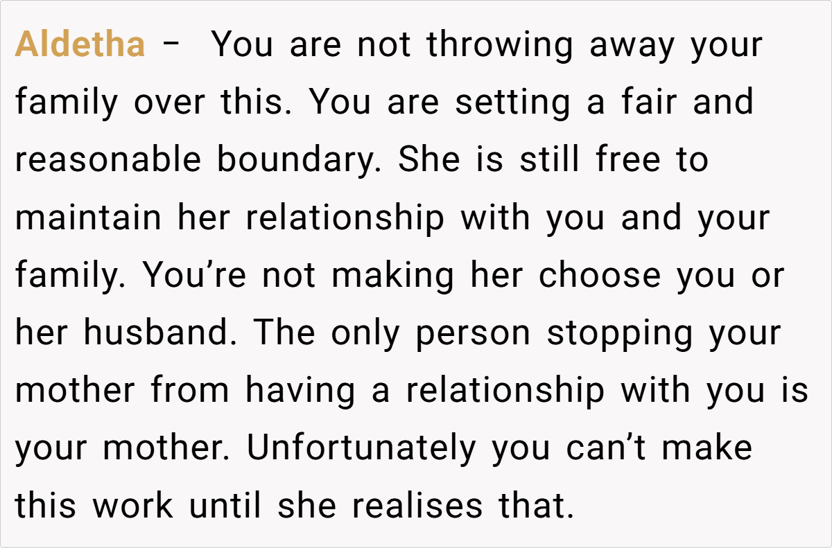 When long-standing family relationships are marred by abusive behavior, establishing clear boundaries is essential. Relationship expert Dr. John Gottman emphasizes that “healthy relationships thrive on mutual respect and clearly defined limits” . In this case, the narrator’s decision to ban her mother’s husband from her home is a response to years of verbal abuse and disrespect—a necessary measure to preserve the sanctity and safety of her immediate family.