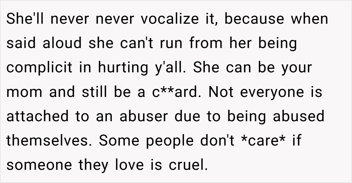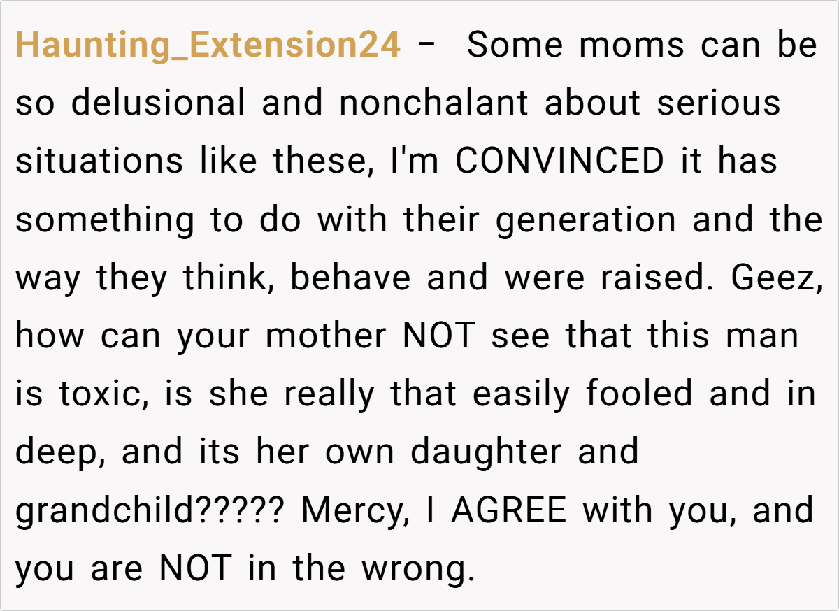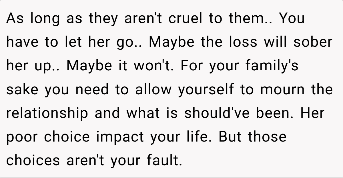 The expert perspective here is that personal well-being should never be sacrificed for the sake of familial loyalty. When boundaries are repeatedly crossed, it not only erodes trust but also endangers emotional health. By drawing a firm line, the narrator is advocating for an environment where respect is non-negotiable. Although her mother’s defensive stance complicates the issue, prioritizing the well-being of her own family remains paramount. In relationships as well as in families, accountability and respect are the cornerstones that allow everyone to thrive.