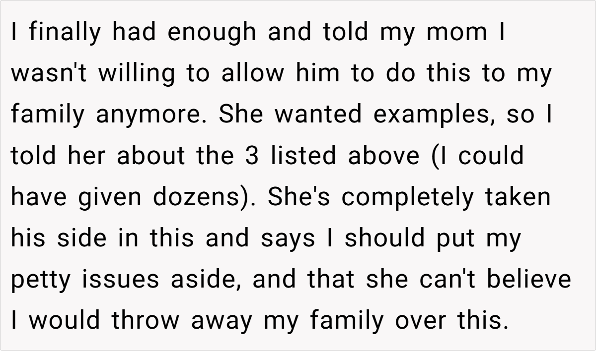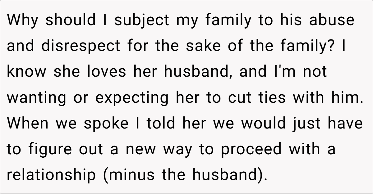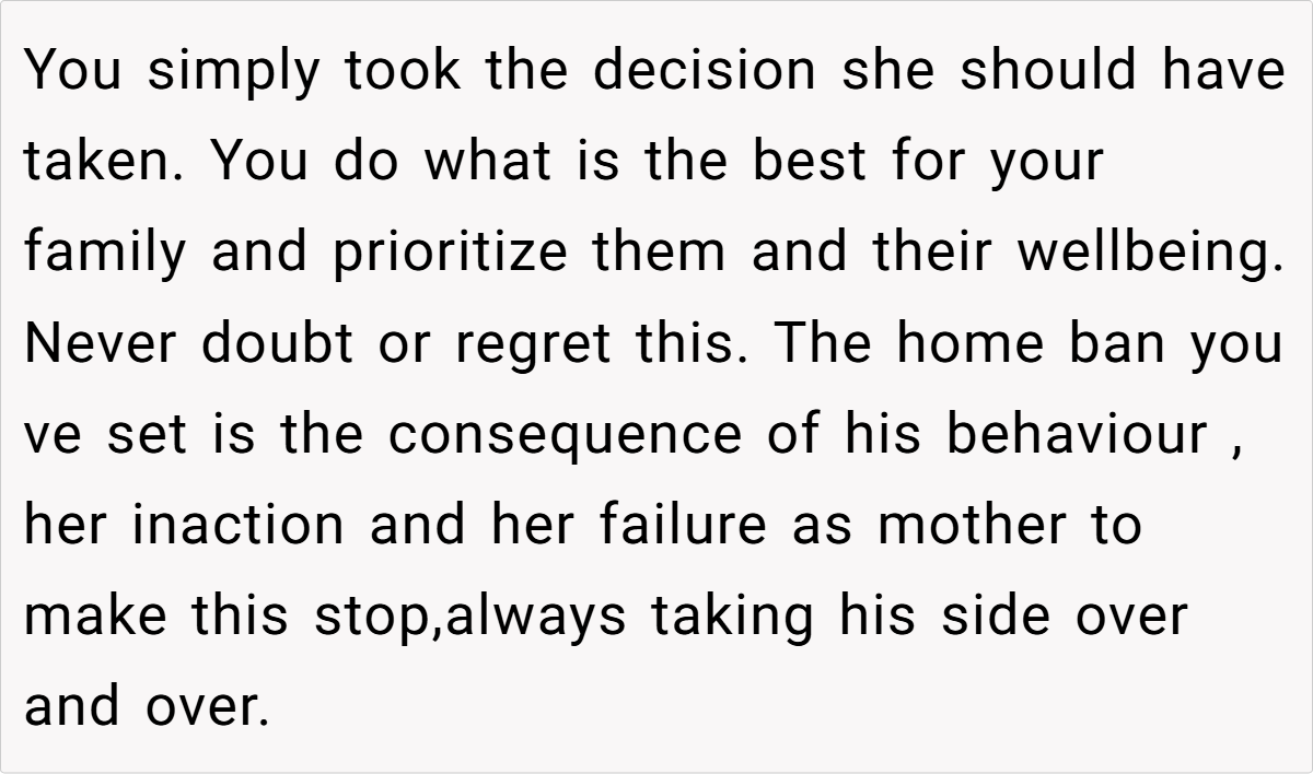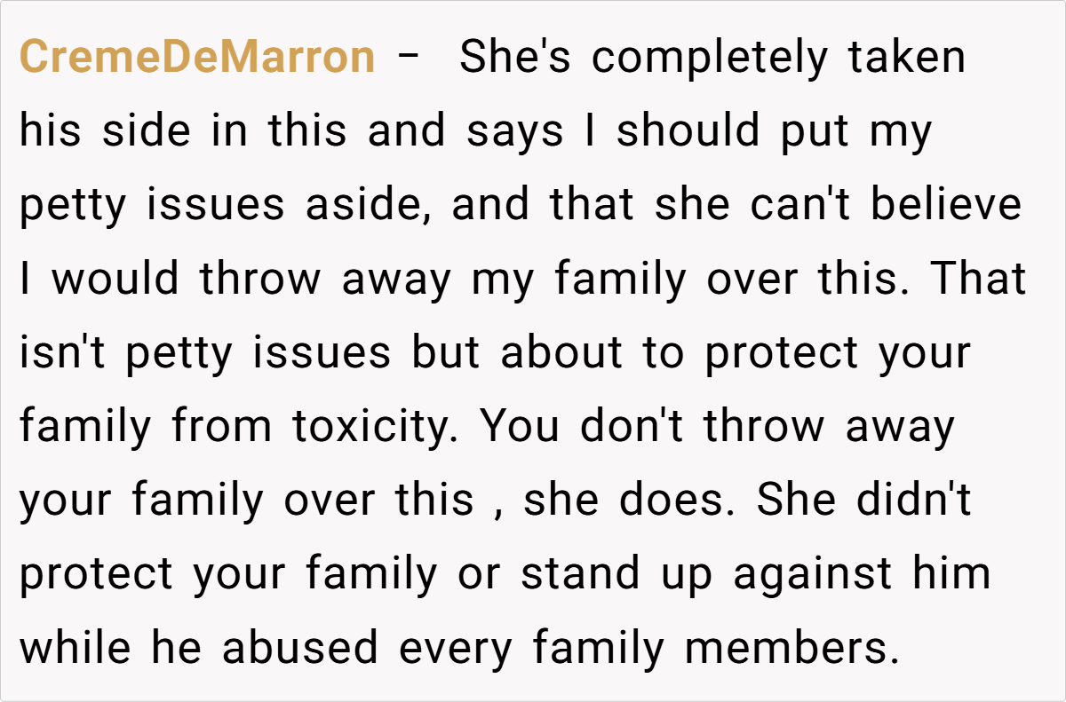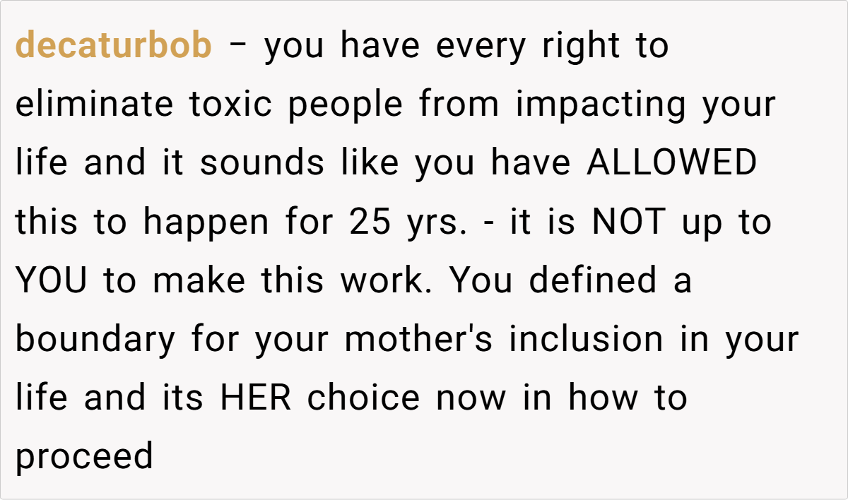 Many support the narrator’s decision to set firm boundaries for her family’s well-being, viewing it as a necessary step to protect against ongoing disrespect and abuse. Others believe that, given the long-standing nature of the relationship, there might have been room for compromise. Overall, most commenters agree that prioritizing personal dignity and emotional health is essential, and that taking action against harmful behavior is justified.