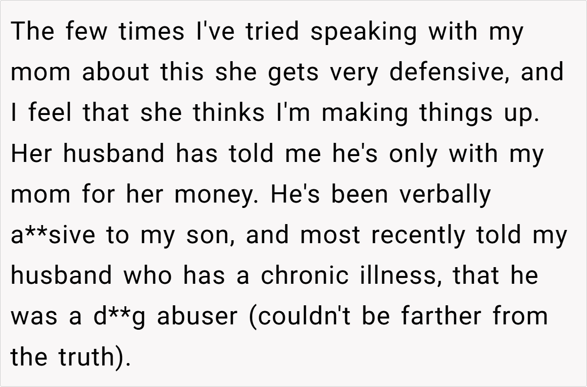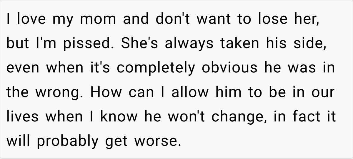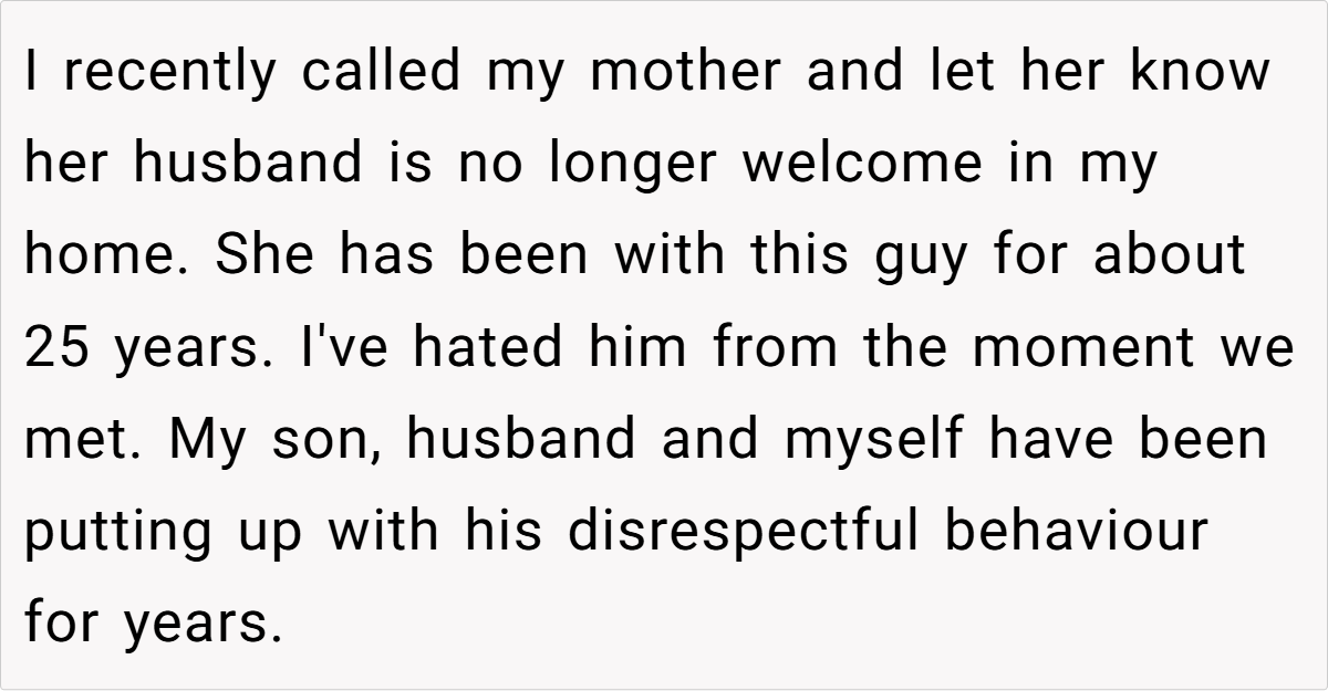 ‘I (50F) told my mother her husband is no longer welcome in my home.’