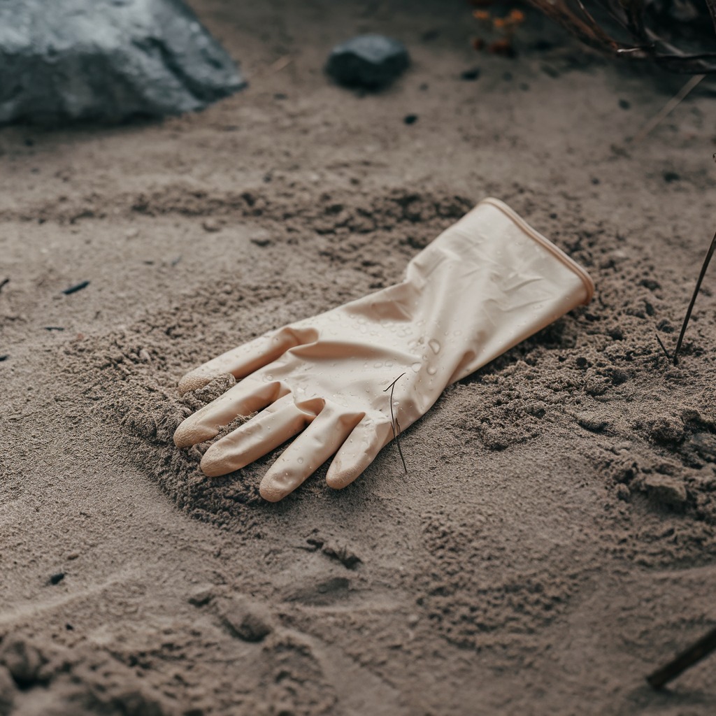 Before long, he returned, holding a dirt-covered shovel in one hand. But when he stepped inside, I noticed something else—an object in his other hand. It was a filthy skin-colored rubber glove, stained with soil and looking like it had been discarded after use. He held it up before me, his movements deliberate and unhurried.