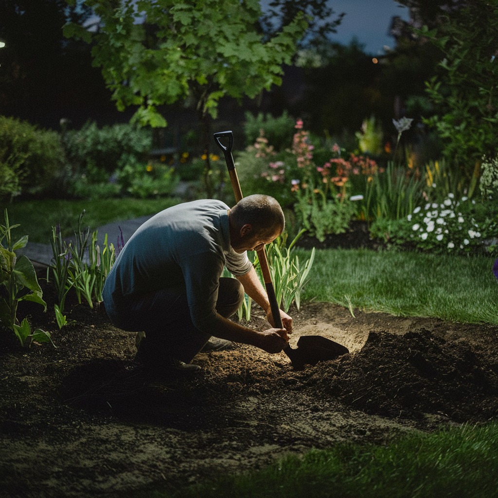 Startled, he turned to face me, the flashlight casting harsh shadows on his face. A moment of silence hung in the air before he chuckled and tried to sound calm. “I’m planting something. I didn’t have time during the day.”
