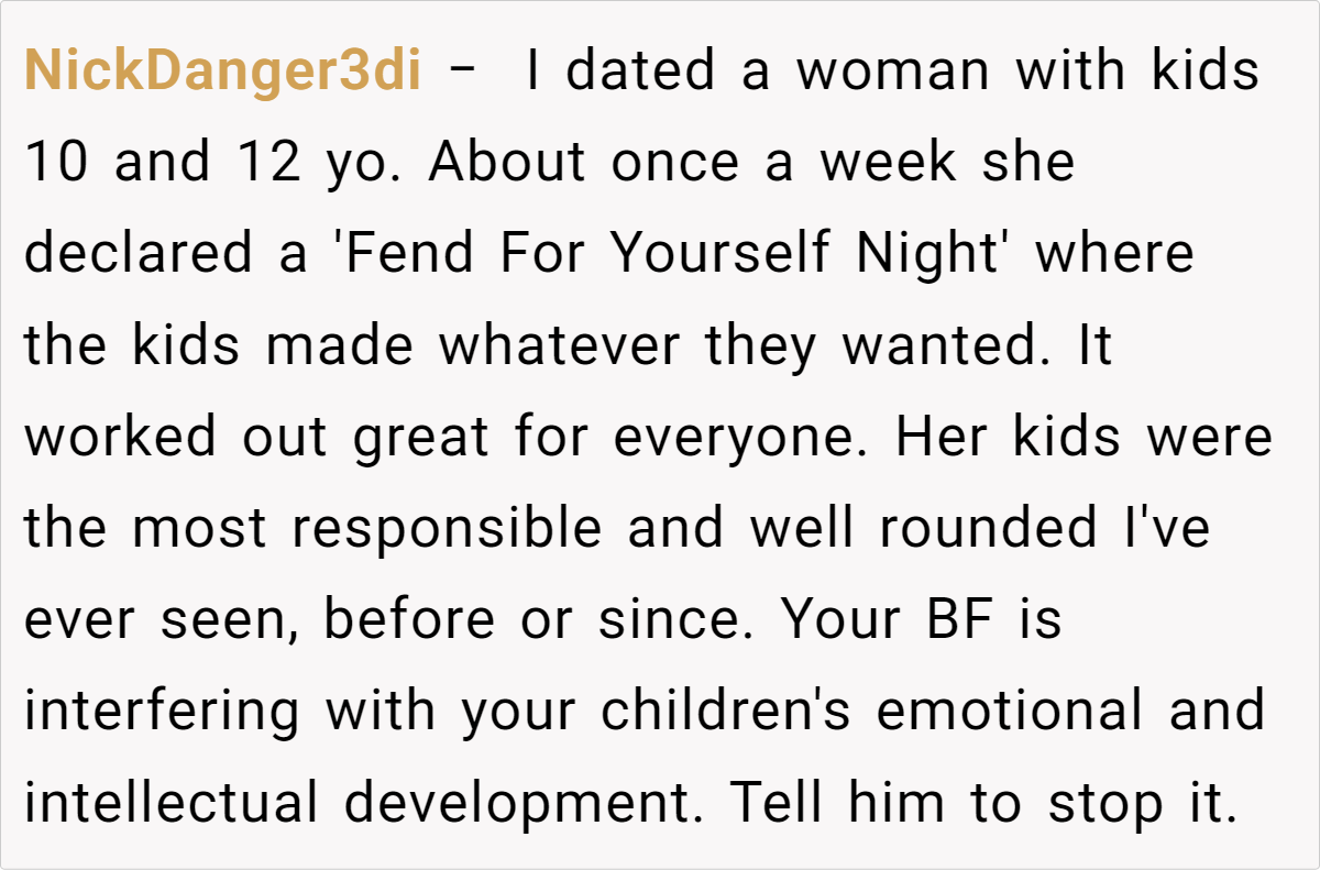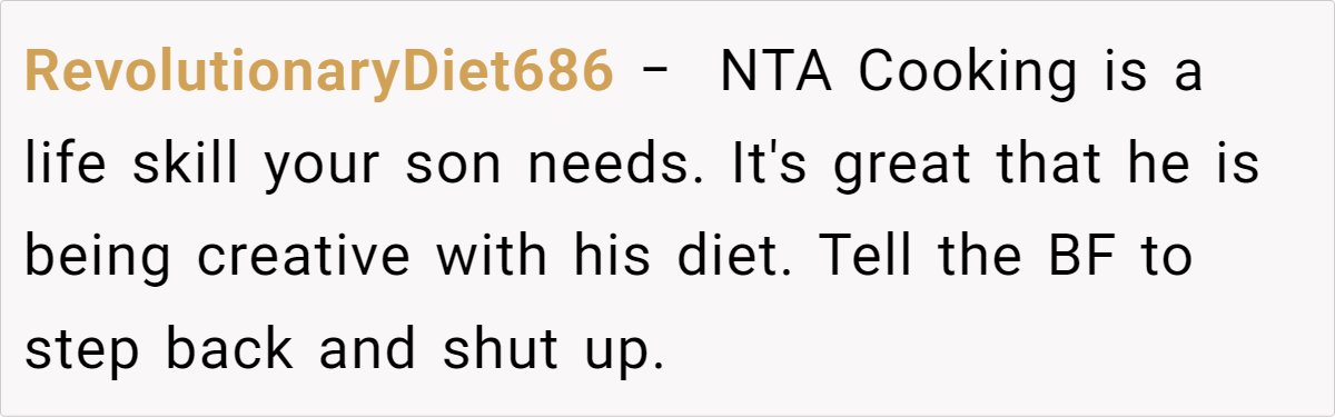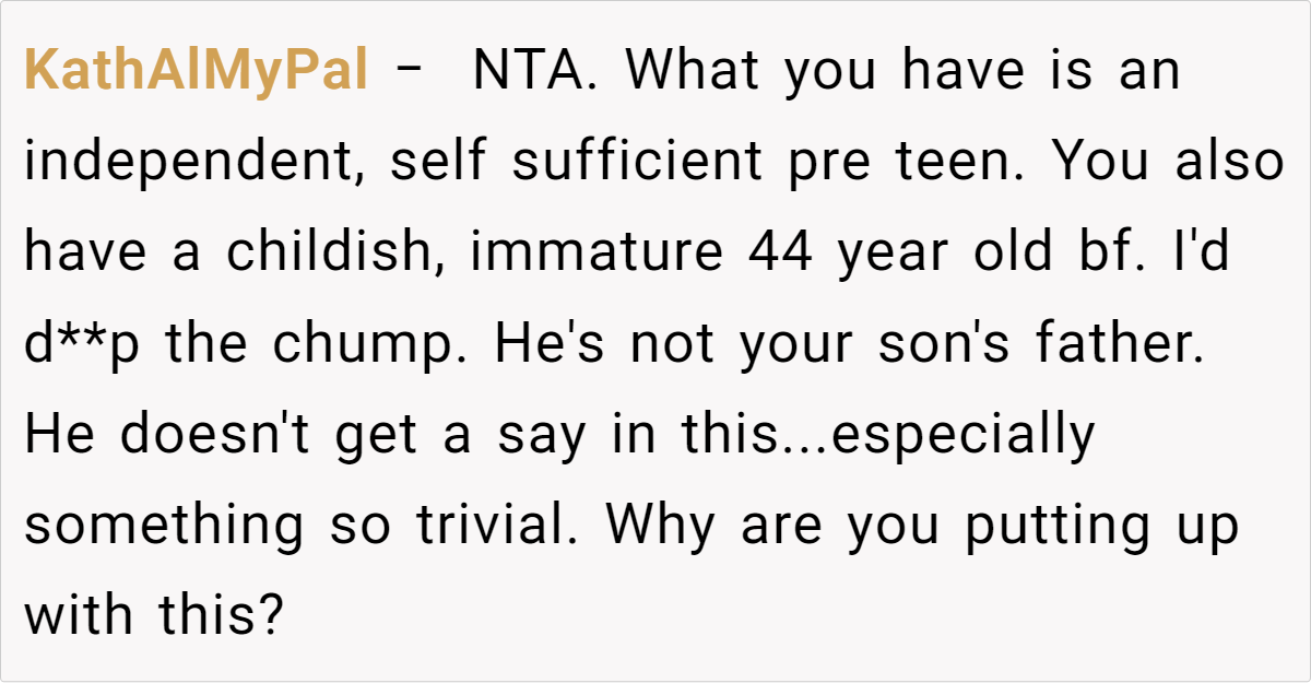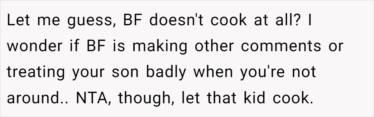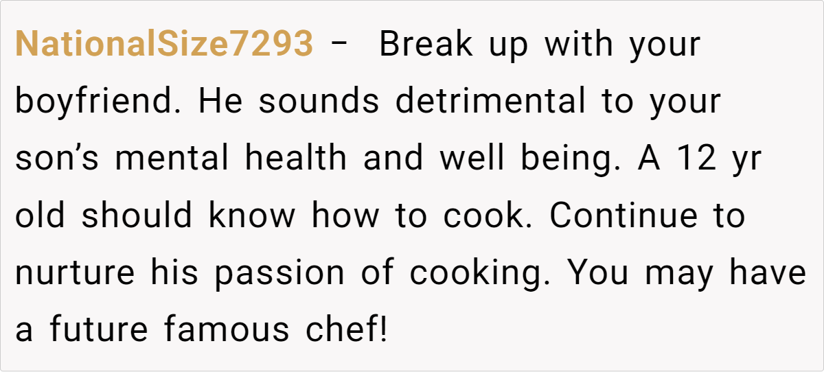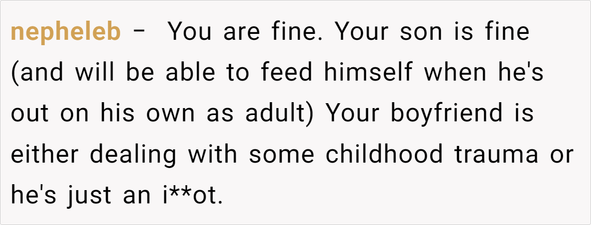 These are popular opinions on Reddit, but do they reflect reality? While some might argue that OP is giving her son too much freedom or not setting enough boundaries, it’s important to remember that encouraging independence and self-sufficiency are essential aspects of parenting. The boyfriend’s criticism of OP’s parenting and his disapproval of her son’s cooking attempts reflect his own controlling tendencies and lack of understanding of child development.