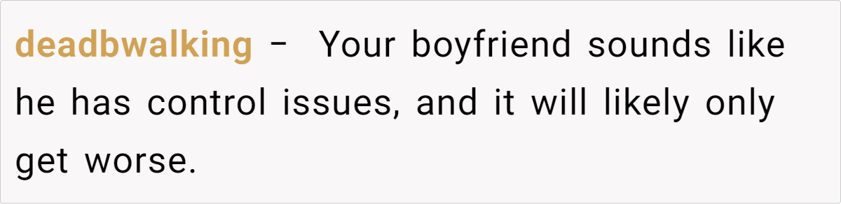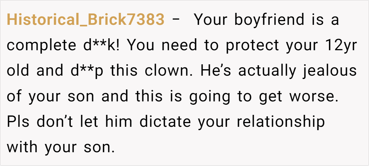 Furthermore, the boyfriend’s controlling behavior and his attempts to dictate how OP parents her child raise concerns about his respect for her autonomy and his potential impact on the family dynamic. Dr. Elmore suggests that “Healthy relationships allow for individual parenting styles and preferences. Partners should support and respect each other’s approaches to raising children, rather than trying to control or undermine them.” (Source: Artificial Maturity: Helping Kids Meet the Challenges of Becoming Authentic Adults)