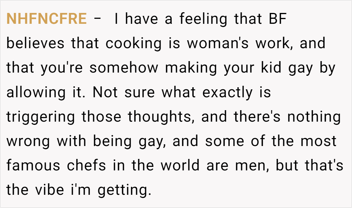 In this case, the boyfriend’s criticism of OP’s parenting and his disapproval of her son’s cooking attempts reflect a potential lack of understanding of child development and the benefits of fostering independence. Dr. Elmore notes that “Children need opportunities to explore their interests, experiment, and learn from their mistakes. Cooking provides a safe and engaging environment for them to develop these skills, while also fostering creativity and a sense of accomplishment.”