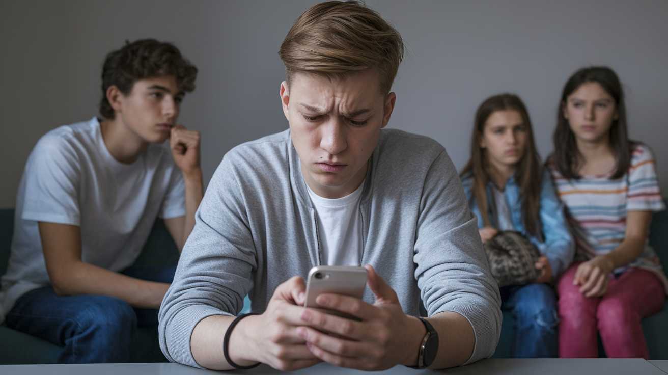A young adult sitting at a table, looking worried and conflicted, holding a phone. In the background, a teenager and two children sit together, emphasizing the weight of responsibility. The scene conveys tension and inner turmoil.