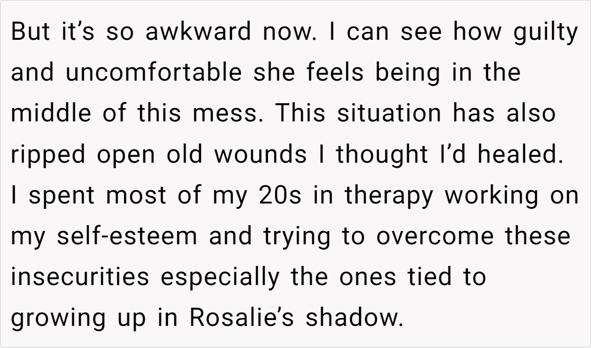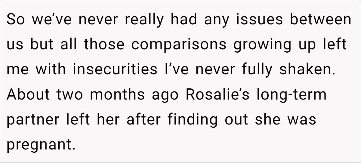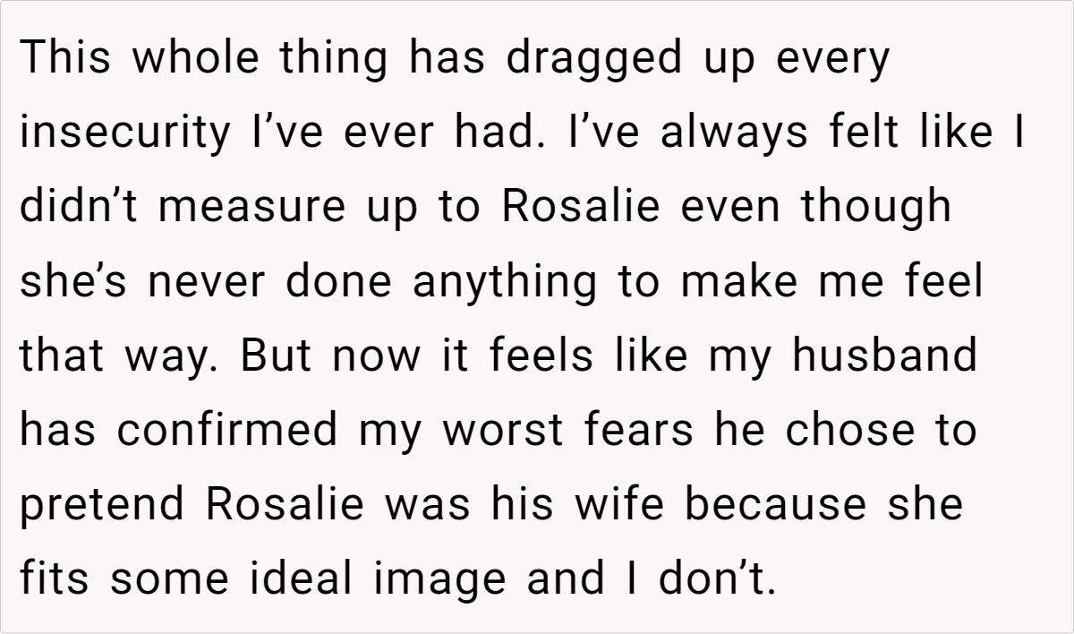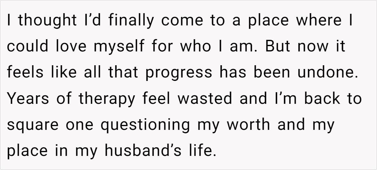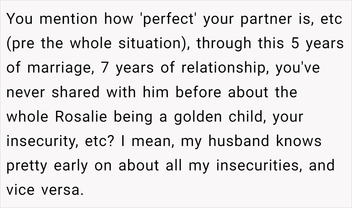 In this case, the wife’s insecurities stem from childhood experiences of being compared to her “golden child” sister and societal pressures to conform to traditional notions of femininity and motherhood.