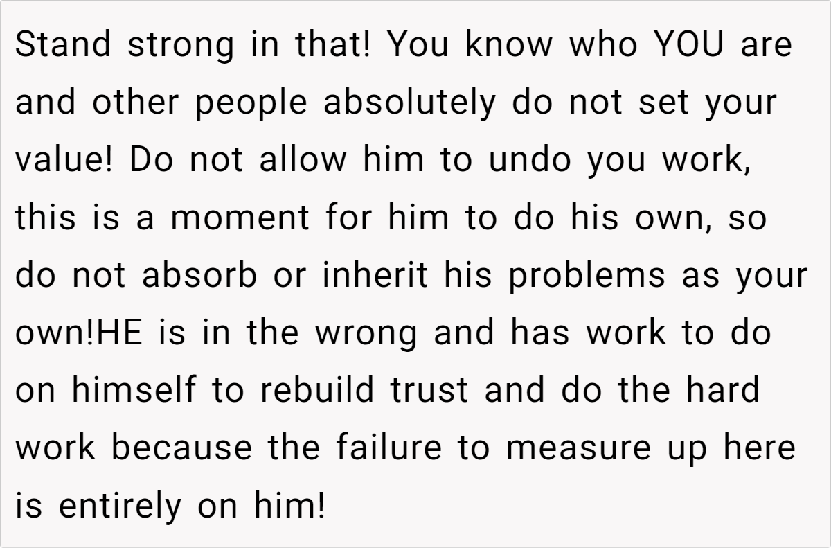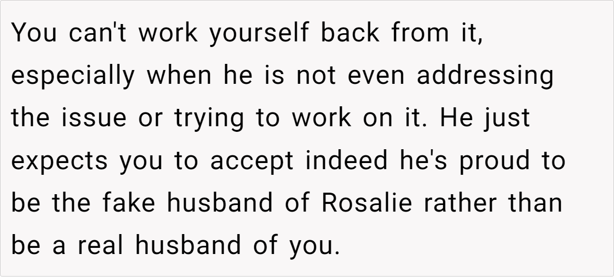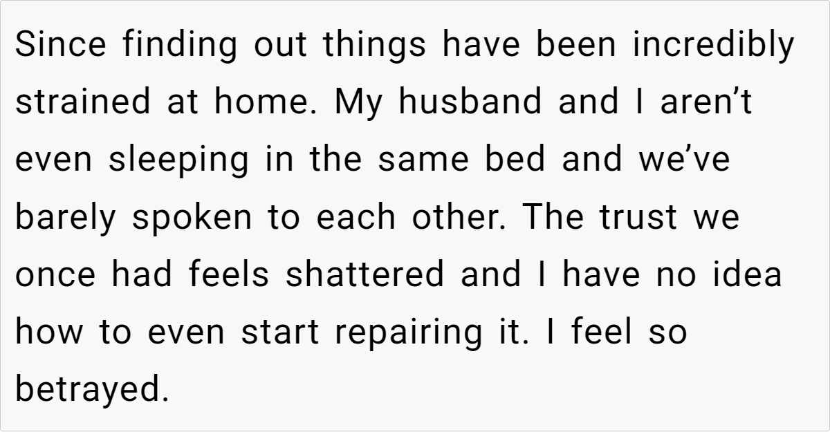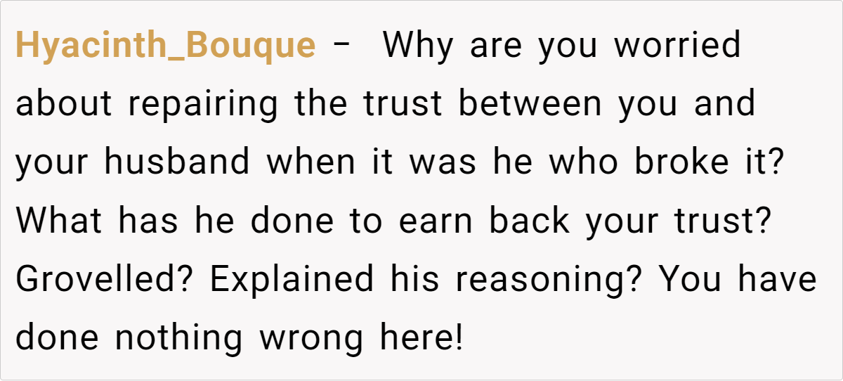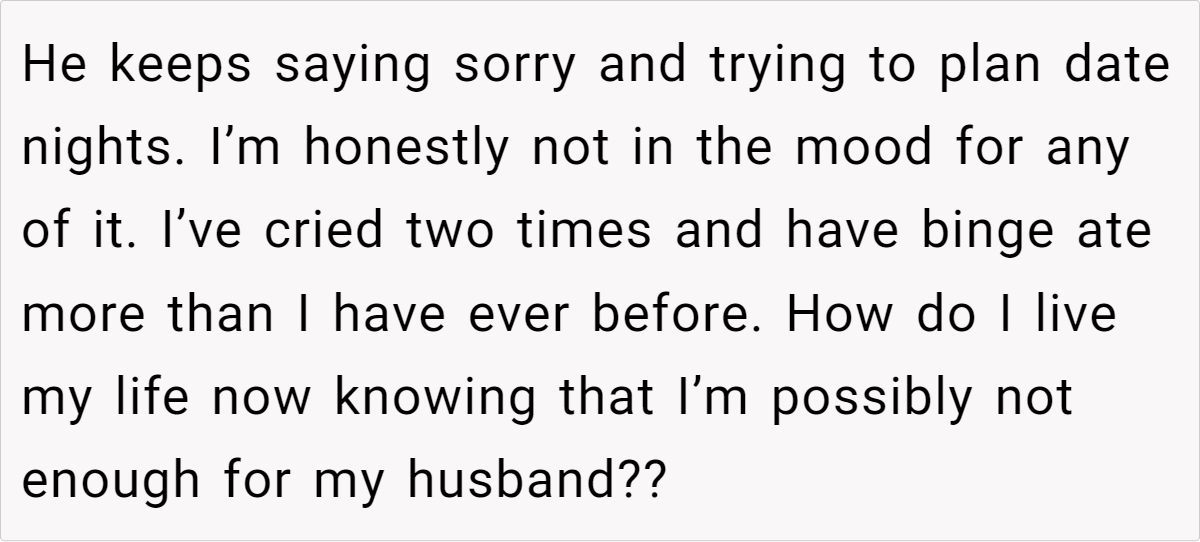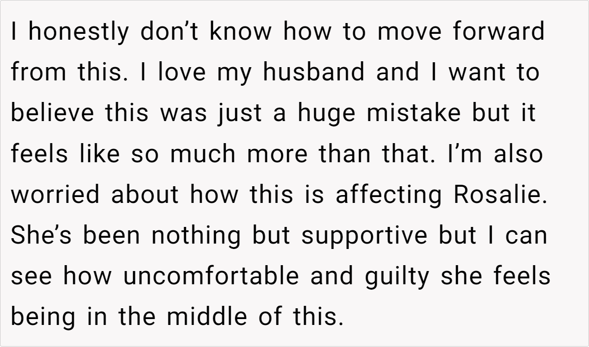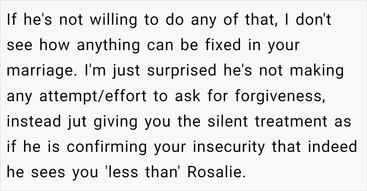 Additional comments: This situation is a stark reminder that even in seemingly strong relationships, hidden insecurities can be triggered by unexpected events. While the husband’s actions are hurtful and damaging, it’s important to acknowledge that his behavior likely stems from his own insecurities and misguided attempts to seek validation.