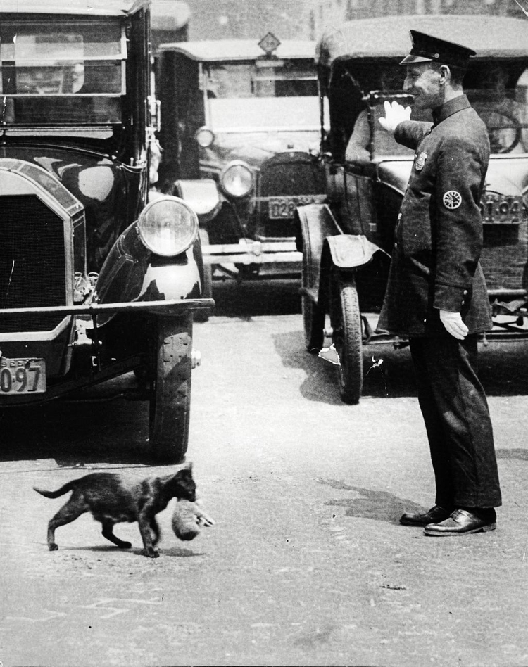 A policeman in New York City stops traffic just for a cat to carry its kittens across the street, 1925