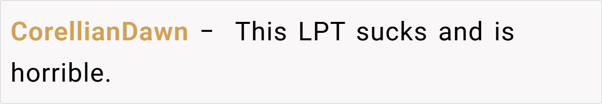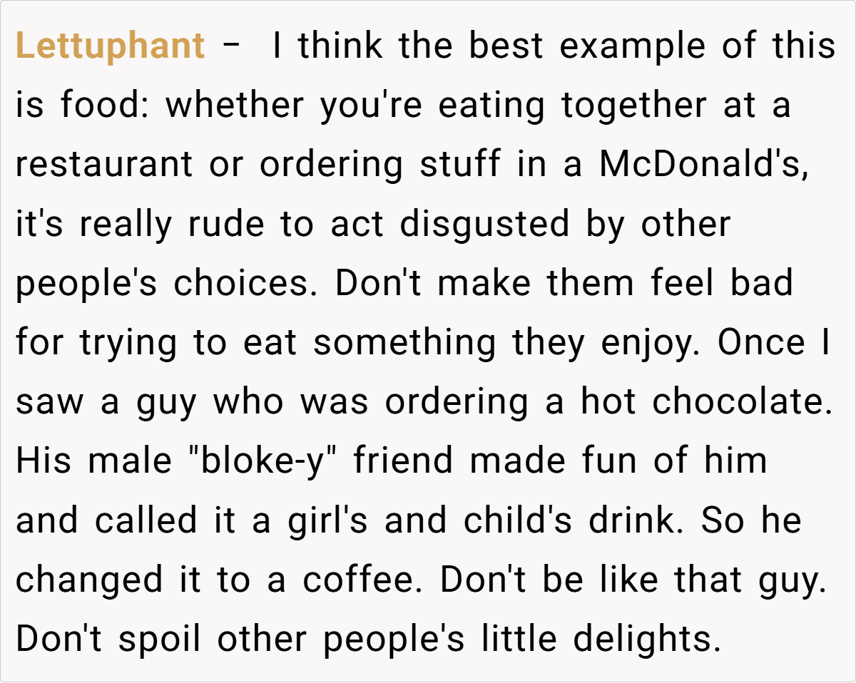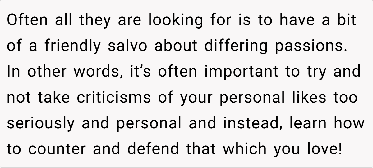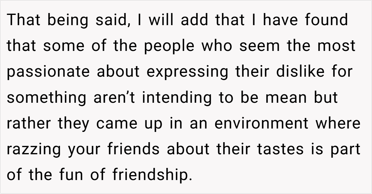 ‘LPT – When sharing your opinion on subjective topics, music, movies, food, etc. There is no need to be hostile. The music doesn’t suck, you just don’t like it. The pizza topping isn’t horrible, you just don’t like it. People’s opinions of you won’t decline if you’re just sharing your likes/dislikes’