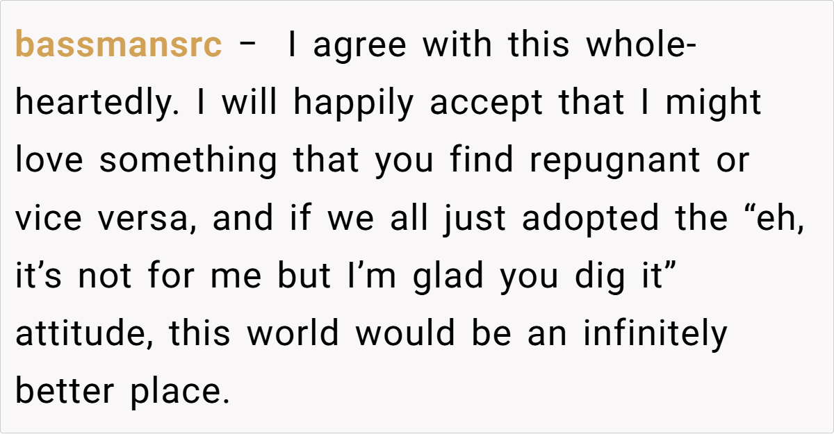 Imagine sitting in a cozy café where every table buzzes with differing opinions on the best pizza topping or the ultimate movie soundtrack. The air is filled with the aroma of freshly brewed coffee and the soft murmur of animated discussions. In this setting, the post nudges us to remember that our personal taste is just that—personal—and there’s no need to impose it on others.