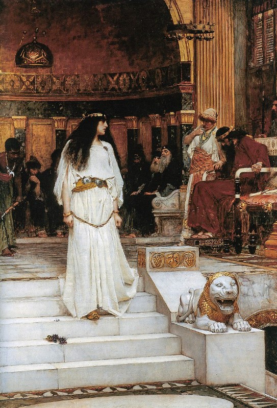 This painting by Waterhouse depicts a dramatic scene involving Mariamne, who was favored among King Herod’s wives. Despite his supposed love for her, false rumors of infidelity led Herod to put Mariamne on trial and ultimately sentence her to death.