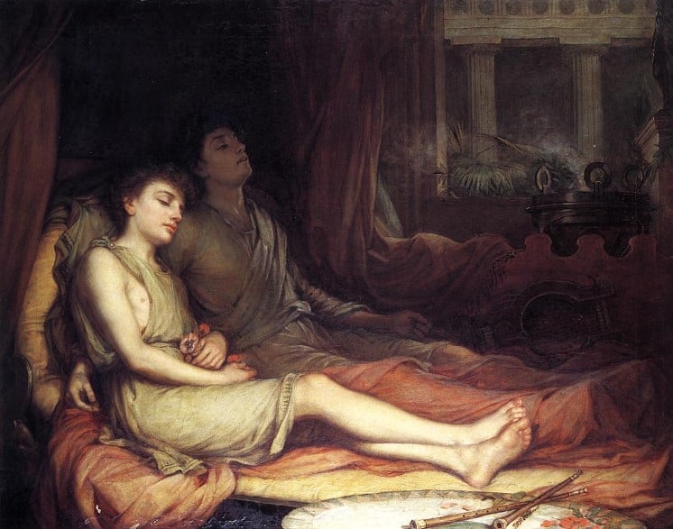 In Greek mythology, the painting symbolizes the brothers Hypnos (representing sleep) and Thanatos (representing death).