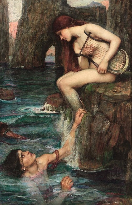 In this painting, a siren is portrayed sitting at the cliff’s edge, holding a lyre, gazing down at a sailor who is floating in the water after a shipwreck. The sailor, in turn, looks up at her. Created in 1900, this artwork is currently held in a private collection.