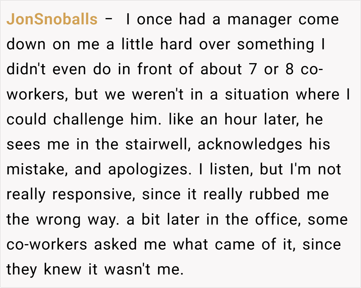 Several users shared personal anecdotes highlighting how their managers successfully employed this method, leading to improved performance and trust within the team. Others cautioned against public criticism, recounting experiences where it led to lasting resentment. In essence, these community insights emphasize that while the rule of thumb is sound, its success depends on the manager’s understanding of their team’s culture and individual sensitivities.