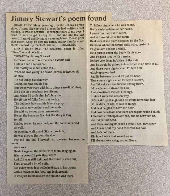 The poem was officially called “Beau,” though some also referred to it as “I’ll Never Forget a Dog Named Beau.” Stewart first recited it on The Tonight Show with Johnny Carson and later published it in a collection titled Jimmy Stewart and His Poems around 1981.