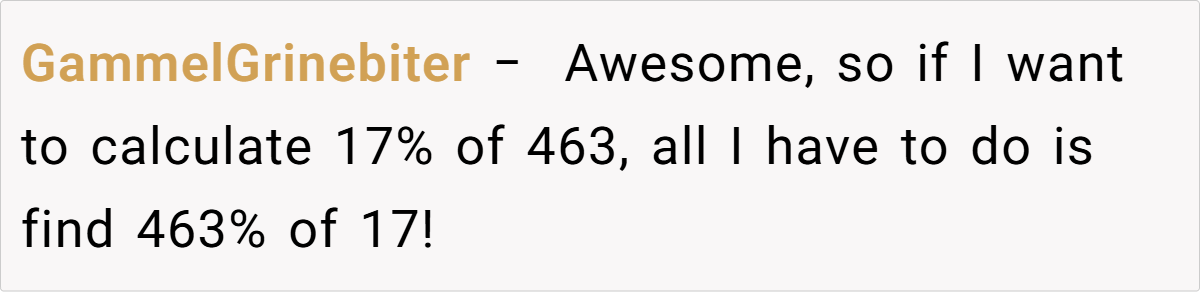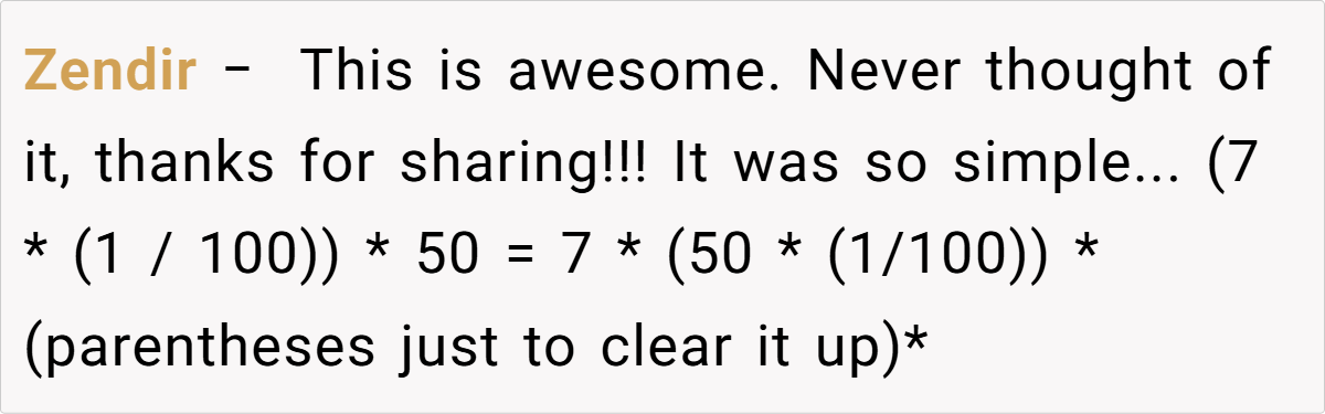 These popular opinions illustrate that while some users simply enjoy the quick mental math trick, others find it a delightful revelation that reshapes their approach to percentages. Do these reactions reflect a broader appreciation for simple math hacks, or are they just clever wordplay? The conversation continues, inviting more voices to weigh in.
