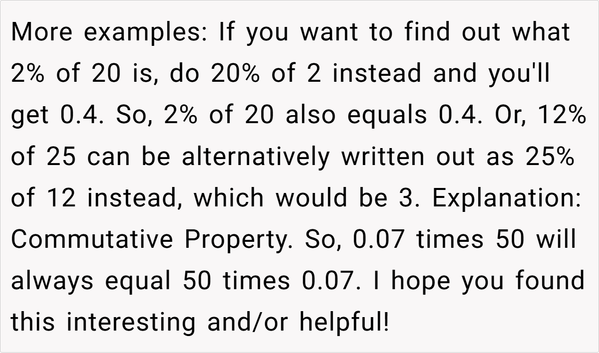 Analyzing the OP’s situation, we see a refreshing example of how basic mathematical principles can demystify everyday calculations. The original post breaks down the concept with clear examples—whether it’s 2% of 20 equating to 20% of 2 or 12% of 25 matching 25% of 12. This demonstration not only simplifies mental math but also encourages us to reframe problems in a way that makes the solution instantly apparent. It’s a small twist in perspective that offers big rewards in clarity.