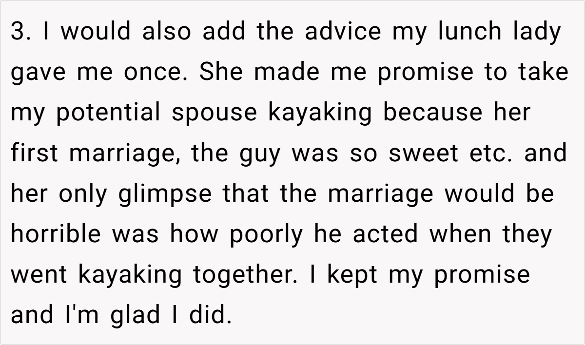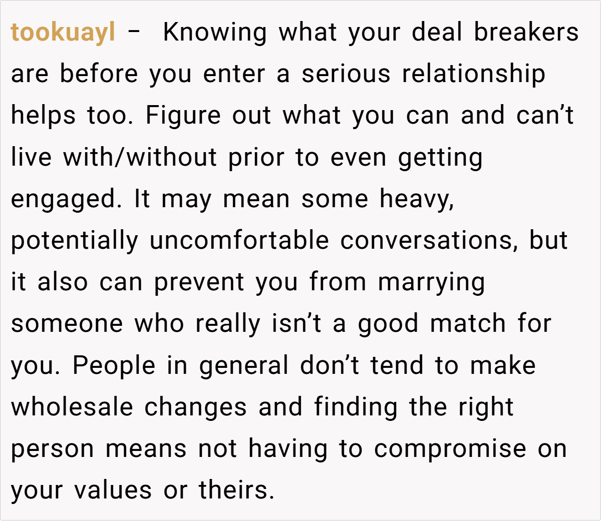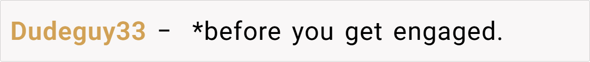 ‘LPT: Before you get married, have in-depth, planning discussions around: kids, money, housing, vacations, current debt, retirement, day to day expectations, pets, in-laws, transportation, and careers…don’t assume anything. Ask the questions, ensure you are on the same page.’