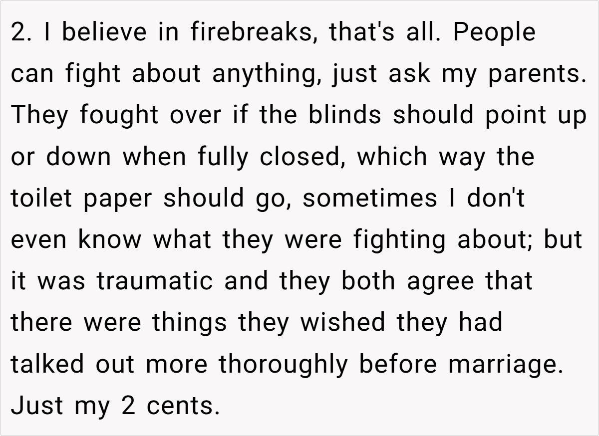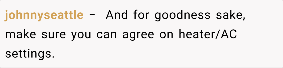 Other Reddit users offer valuable insights as well. One suggests adding seemingly trivial but potentially divisive topics, such as “Should we both agree on heater/AC settings?” It’s funny, but those small things can escalate if not addressed.