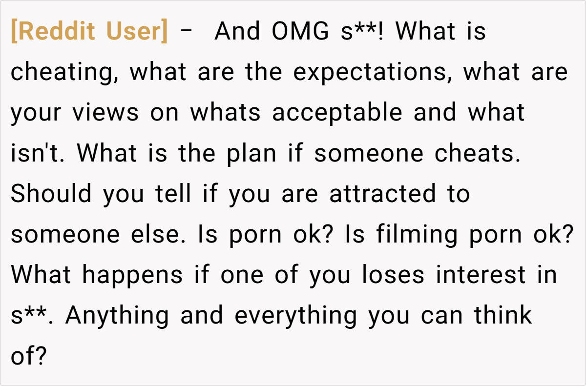Another user highlights the significance of talking about personal boundaries, “What’s your view on cheating? What happens if someone loses interest in s**?” These questions can sometimes be uncomfortable, but they reflect deeper values that influence how well a couple will navigate the tricky times.