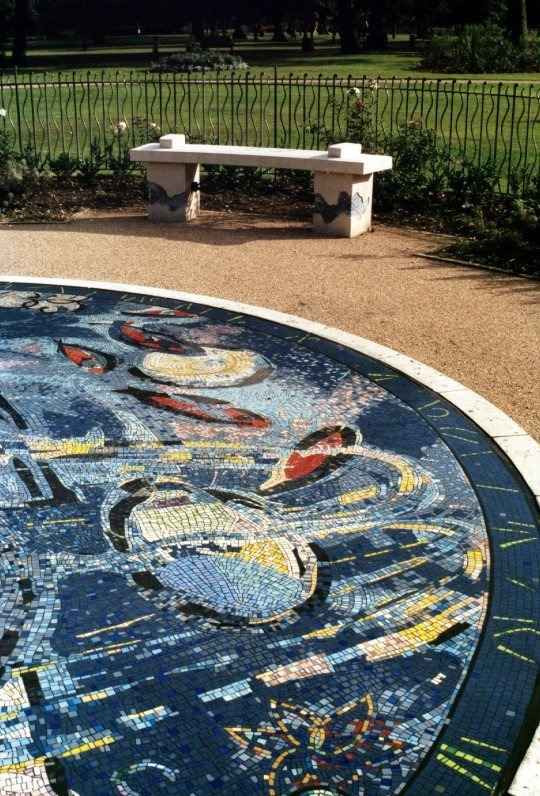 In 2000, Gary Drostle and Rob Turner were commissioned to create a nine-meter-diameter mosaic in Southampton East Park. Inspired by Caroline Ishgar’s design, which was influenced by the Croydon fishpond, this project pushed their mosaic skills to new heights.