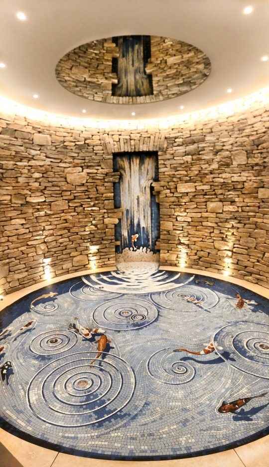 This interior fishpond mosaic features a captivating waterfall, water-up jets, and a central drain, making it a truly unique wet room. The floor is adorned with swimming fish and a cascading waterfall, transforming the space into an enchanting aquatic oasis.
