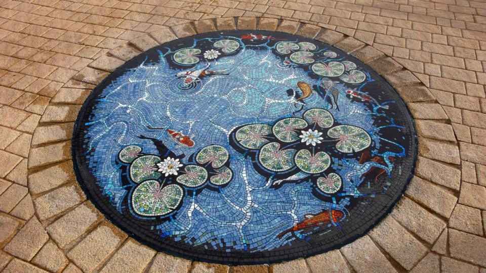 The London Borough of Croydon requested a small two-meter mosaic, simply instructing, “Do what you think will be best.” This open-ended brief was challenging for Drostle. Little did he know his trompe l’oeil fishpond design would inspire a series of similar works.