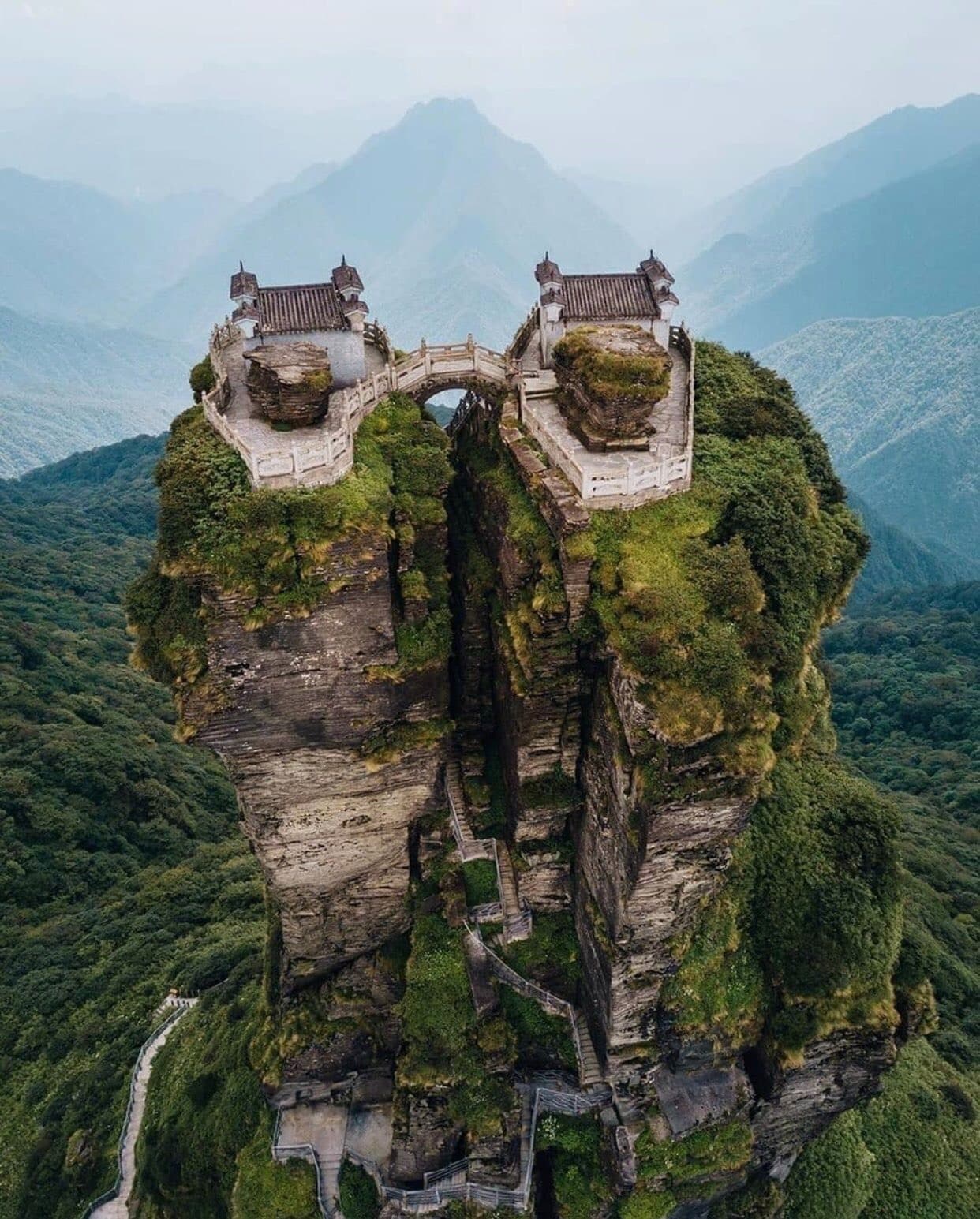 These temples sit 2,336 meters (7,664 feet) above sea level and are connected by a narrow stone bridge over the Gold Sword Gorge.