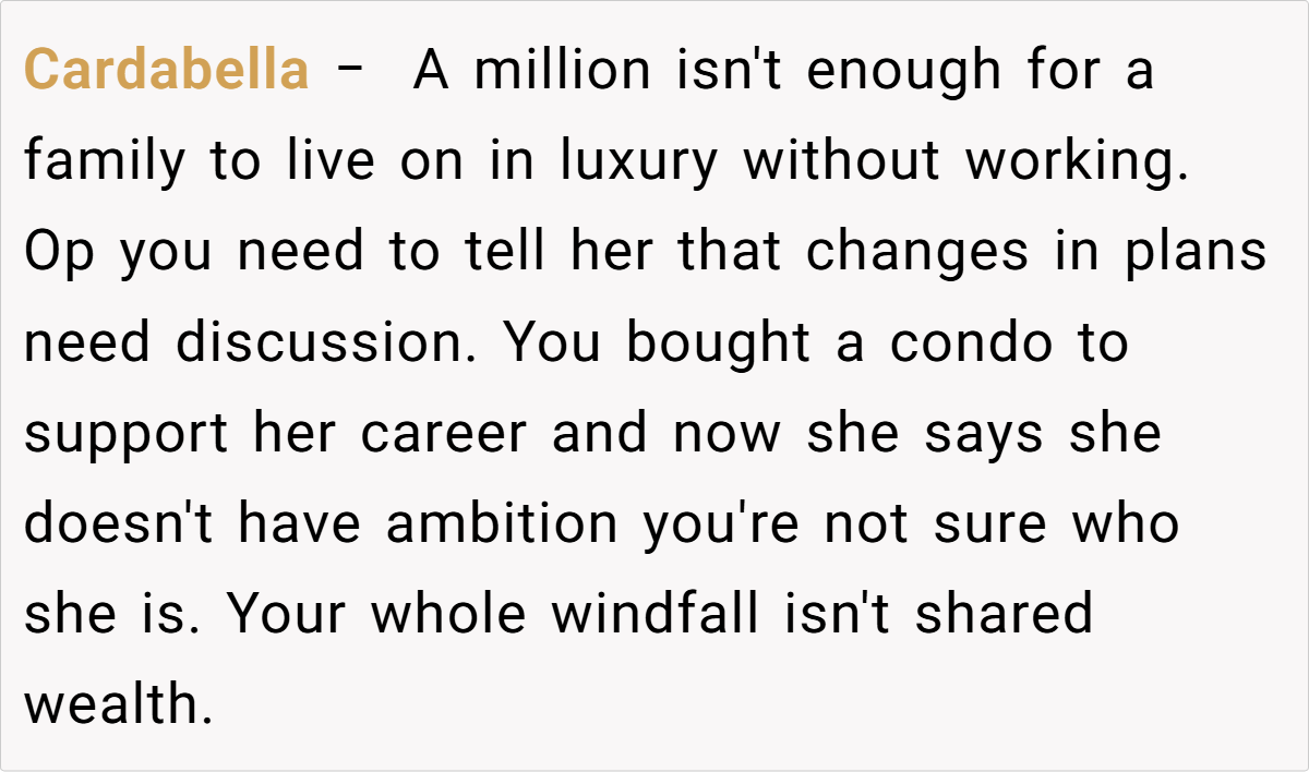 Reddit’s community has weighed in on this modern dilemma with a mix of humor and heartfelt advice. Many have joked that “when money talks, ambition sometimes takes a coffee break,” while others sympathize with the struggle of maintaining one’s identity amid sudden prosperity. The prevailing sentiment is that a relationship thrives on shared dreams, and without that, even love may not be enough to hold everything together.