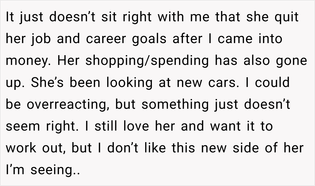 Financial prosperity can sometimes unmask deeper issues. The sudden influx of wealth may inadvertently trigger a crisis of identity in one partner, leading her to question her prior goals. In this scenario, the girlfriend’s abandonment of her nursing career—coupled with a surge in lavish spending—could be interpreted as either a defensive response or a red flag of deeper dissatisfaction. Such drastic lifestyle changes can create an imbalance, turning what was once a mutually supportive relationship into one marked by disillusionment and unmet expectations.