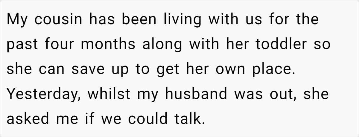 This revelation isn’t just surprising; it challenges the very foundations of your family’s trust and stability. It leaves you reeling and unsure about how to proceed, especially when your cousin’s circumstances make it difficult to simply ask her to leave.