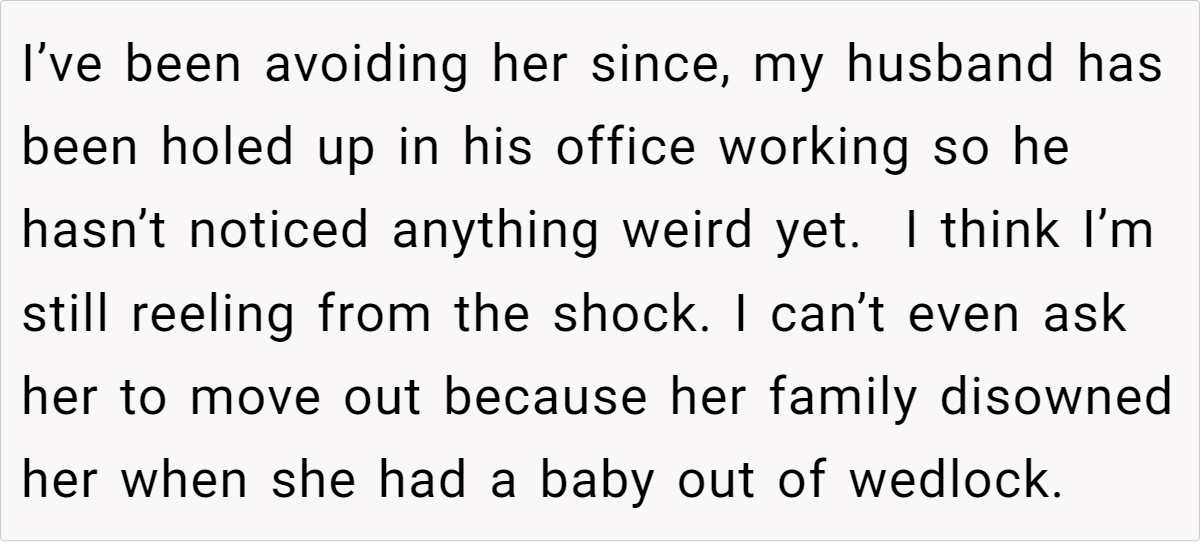 Now, with her living with you for a few more months and her toddler in tow, the situation feels even more inescapable. The pressure of potentially disrupting your household—and making your nephew homeless during a pandemic—only intensifies your inner conflict. You’re caught between protecting your family and dealing with a betrayal that cuts deep.