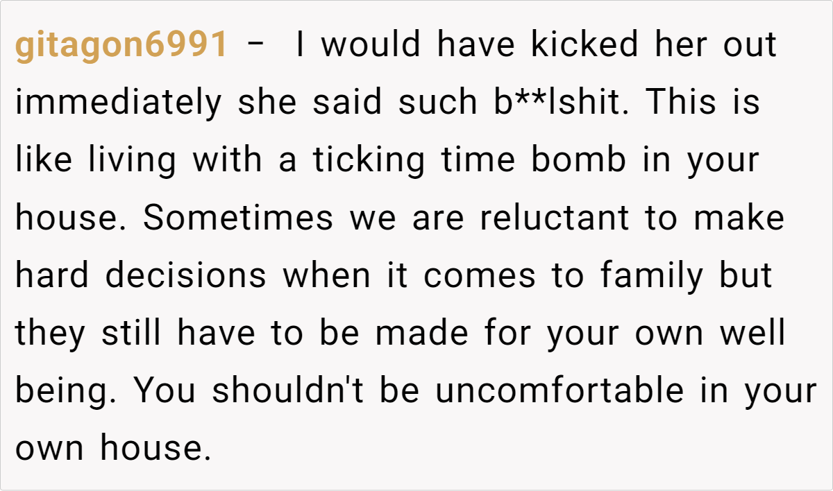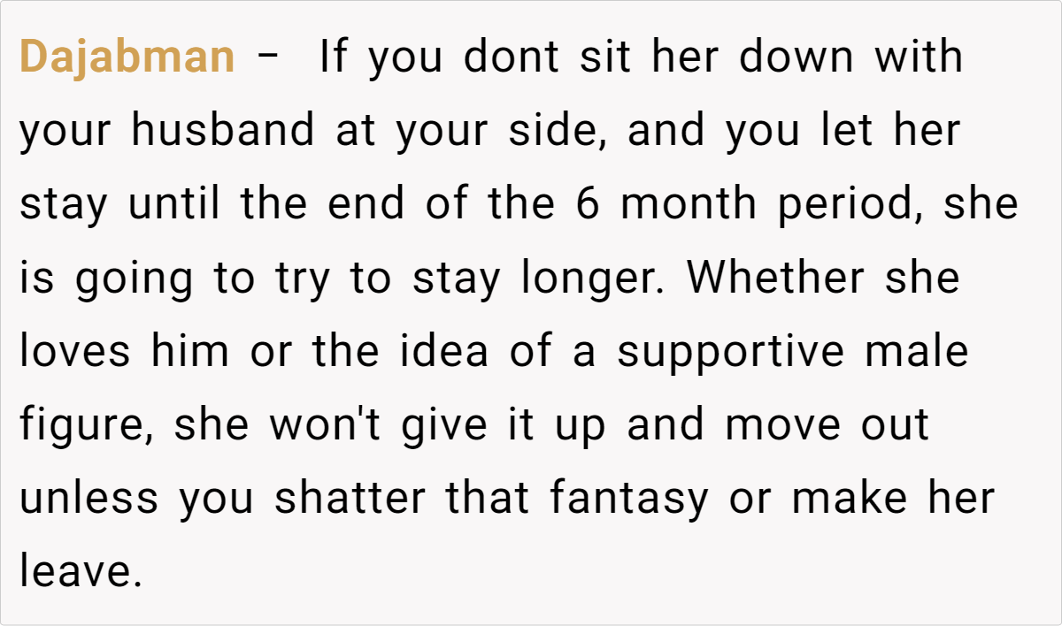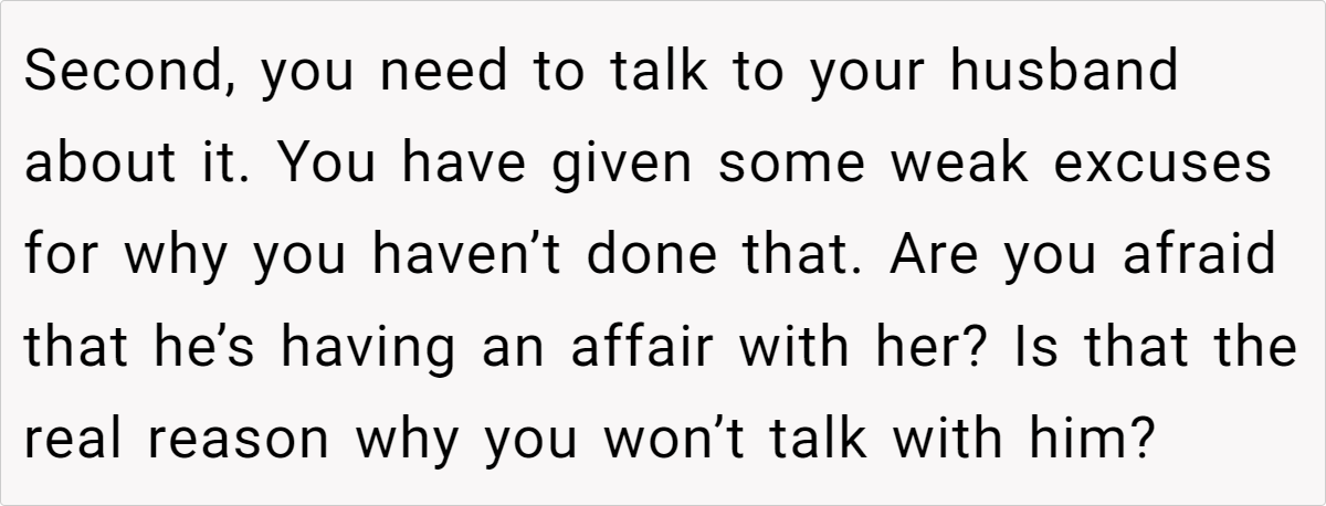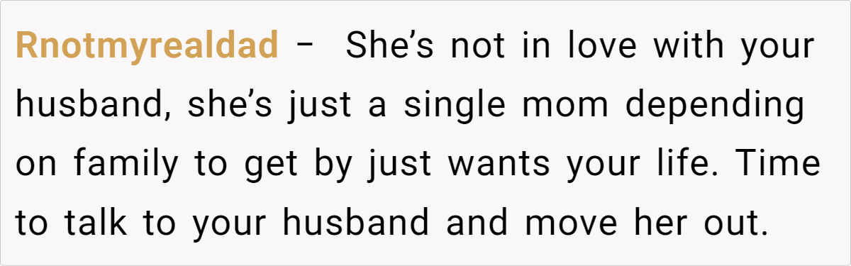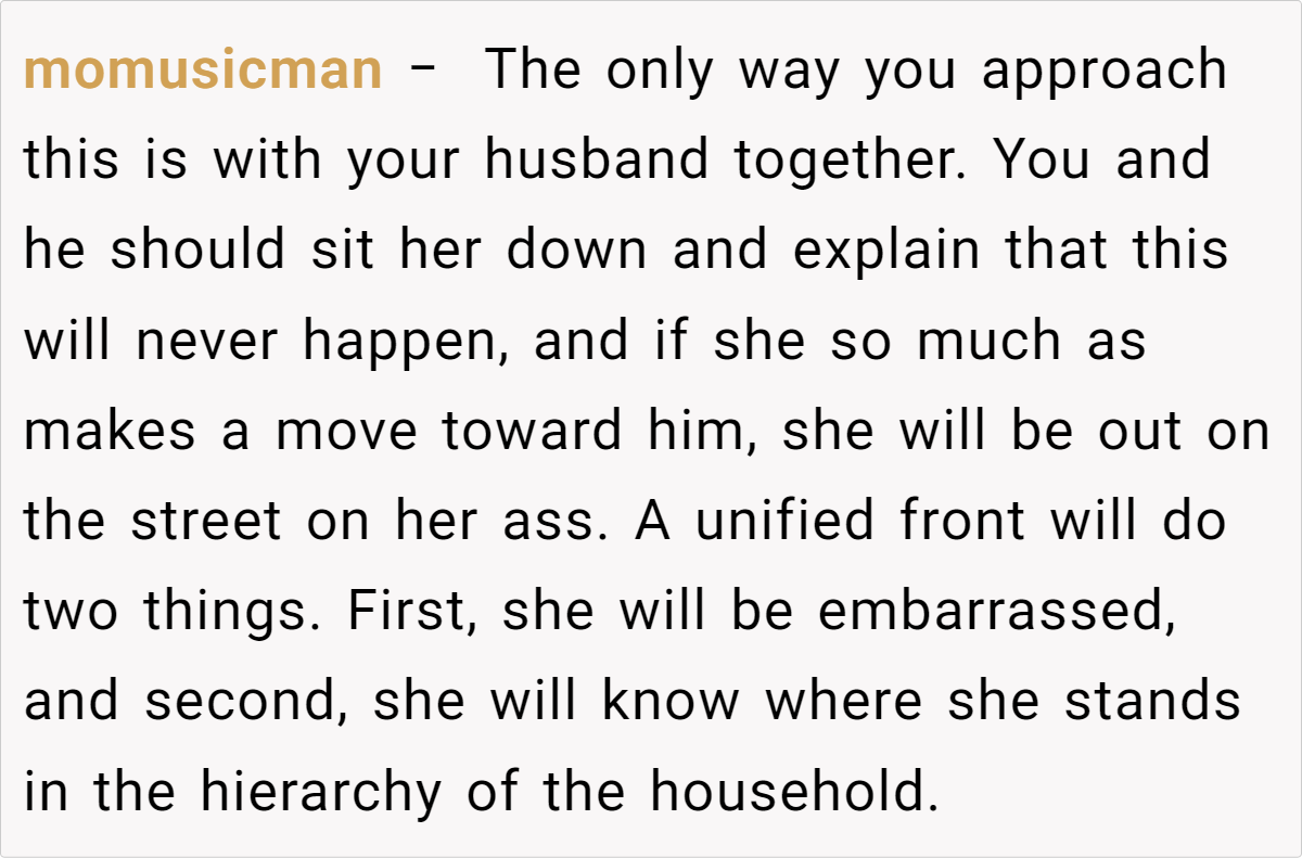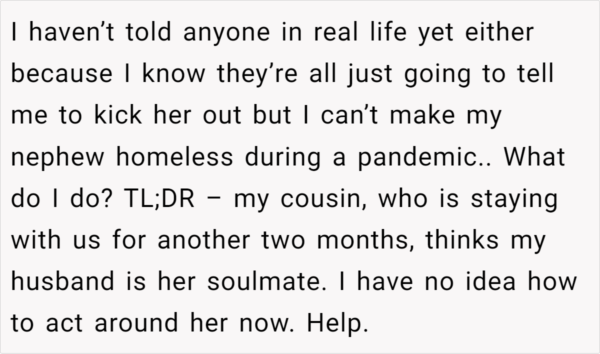 Many commenters agree that a joint conversation with your husband is essential. Some suggest establishing a strict “no crossing the line” policy and, if necessary, asking your cousin to move out. Others emphasize that while her circumstances are unfortunate, her confession crosses a boundary that can’t be ignored. The consensus is that clear communication and a unified front are key to protecting your family.