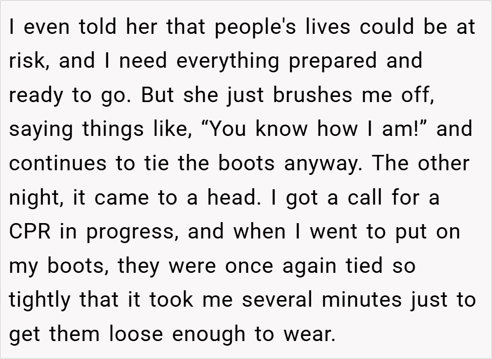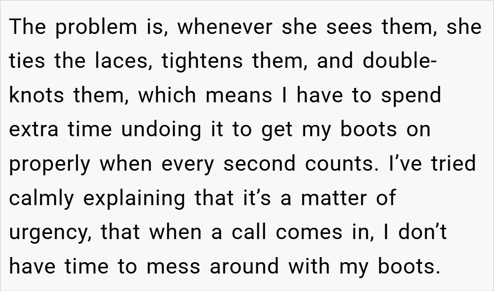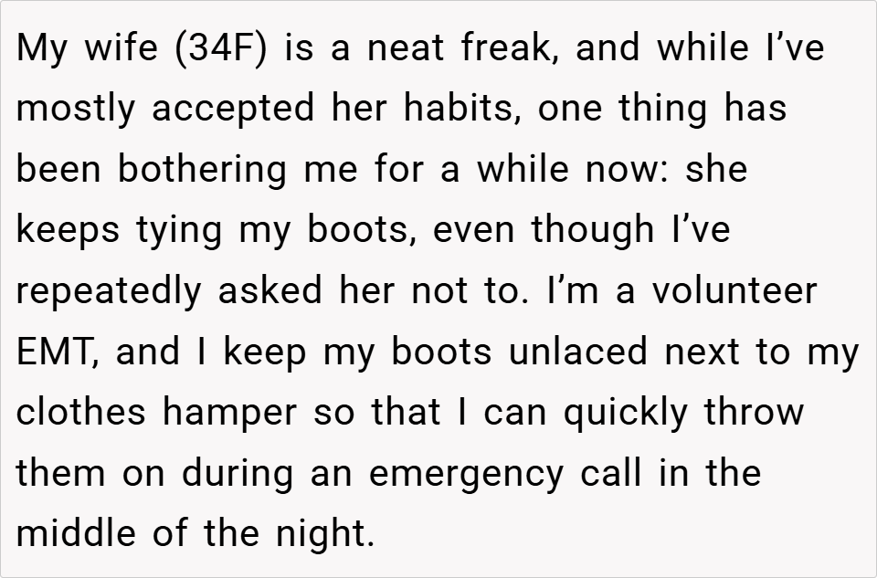 The user (34M) is struggling with his wife (34F), who is a neat freak and keeps tying his boots, despite his repeated requests not to. As a volunteer EMT, he needs the boots to be left untied for quick access during emergencies.