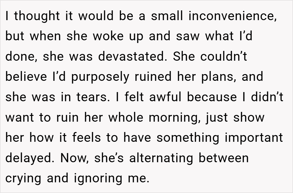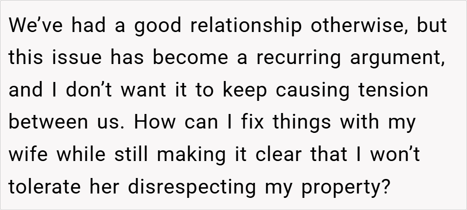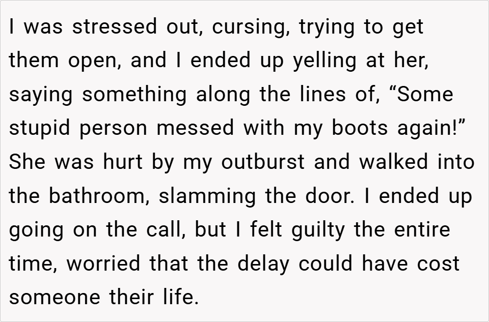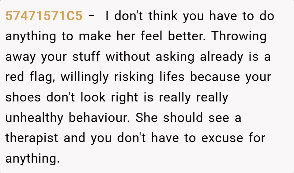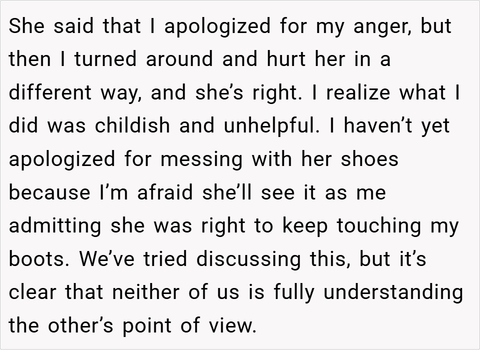 After a stressful incident, he yelled at her, which hurt her feelings. In an attempt to get her to understand his frustration, he retaliated by messing with her shoes, which only made things worse. Now, the tension is high, and he’s unsure how to resolve the issue while maintaining respect for his own boundaries.