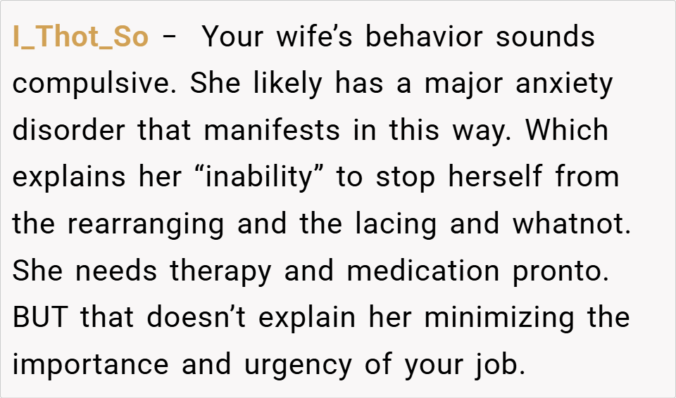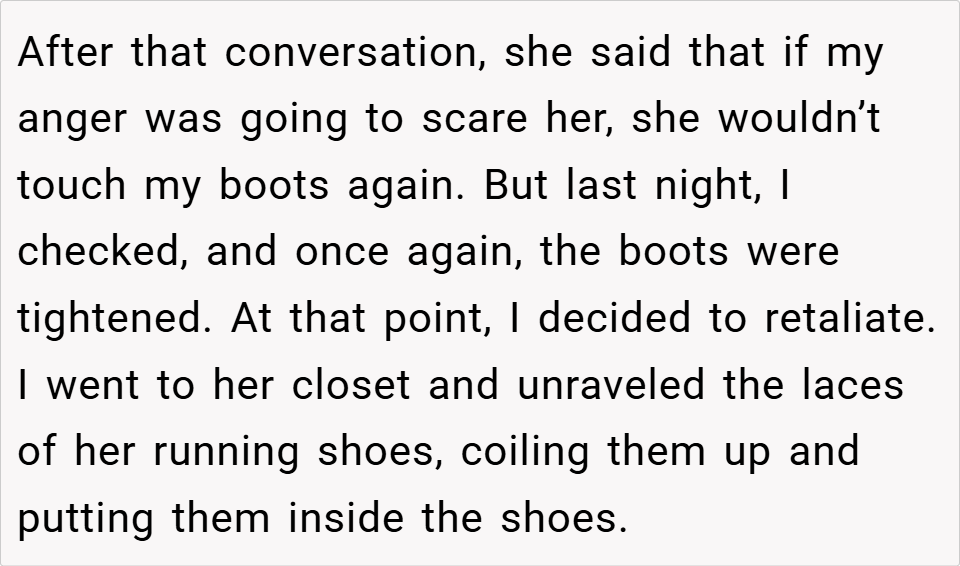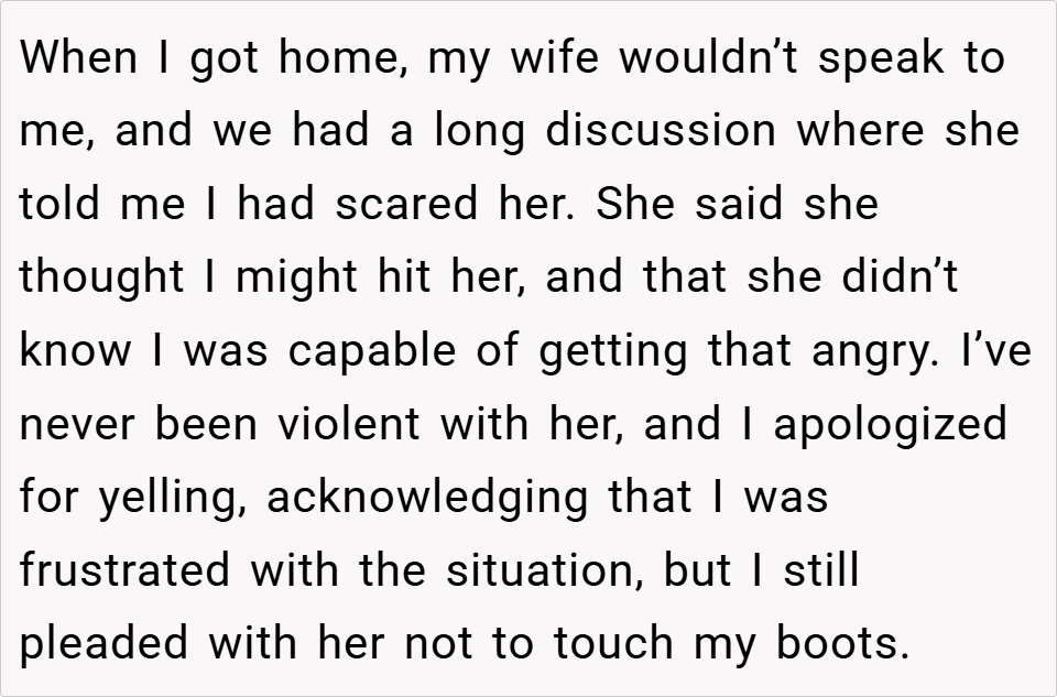 ‘ My [36M] wife [34F] keeps tying my boots after I’ve told her to keep her hands off of them. I tried to teach her a lesson and really hurt her feelings.’