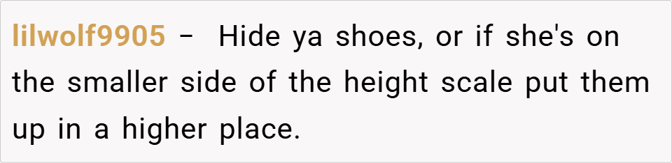 Just leave her she sounds very childish and dumb. You yelled and she got scared like wtf ok well don’t touch people shit even kids know that did you marry a 5yo or a lady with brain damage like she gets a taste of her own medicine and cries what a baby seems like you probably will have more problems in the future staying with someone who is dumb and a baby it’s either hide the shoes stay with a baby or leave and be in peace. That comment saying imagine she gets hit and the emt is late cause his dumb wife f**ked with his gear is hilarious and true. Even a child who know your jobs important would not touch your stuff. You can tell your wife as a lady shes pathetic and childish af hope she gets mental help or maybe an iq test too.