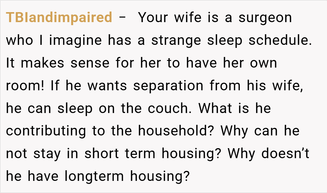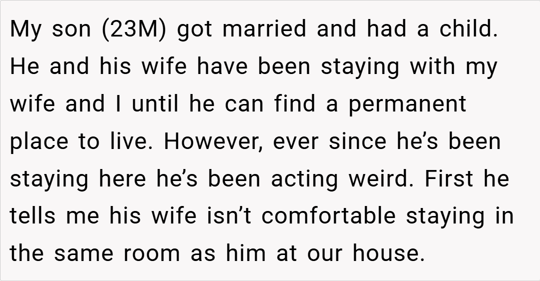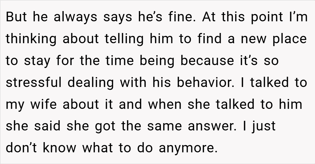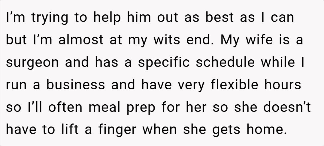 With his wife, a surgeon with strict work hours, and himself, running a flexible business, the constant strain has led him to consider asking his son to find alternative living arrangements. Now, he wonders if he’s in the wrong for wanting his home to remain a peaceful space, or if his frustration is completely justified.