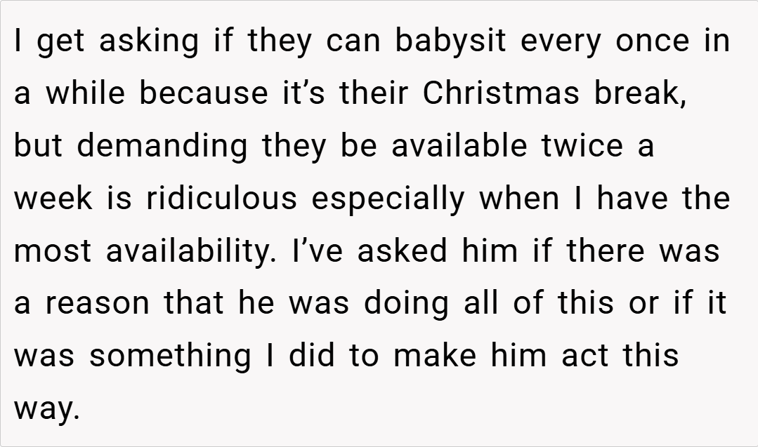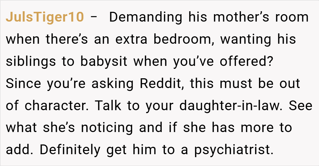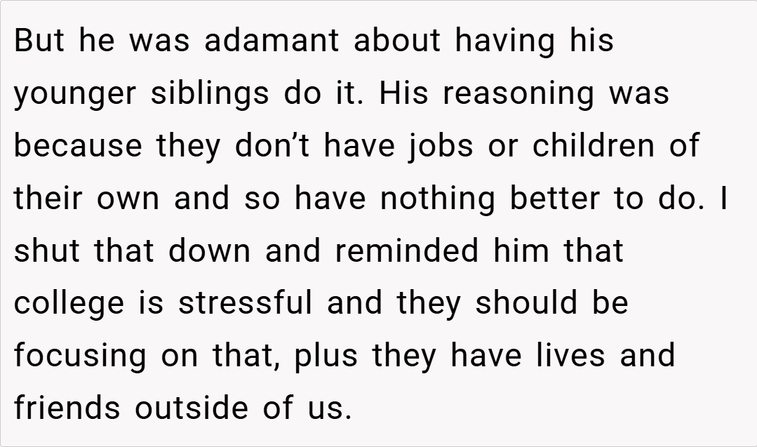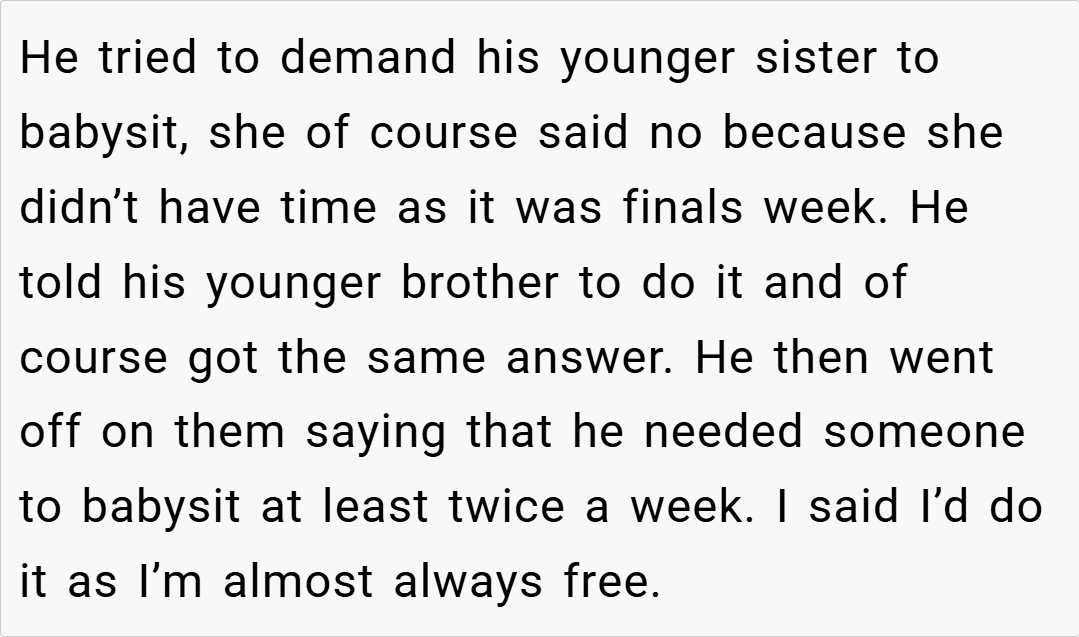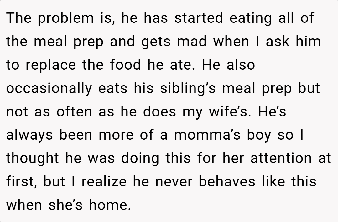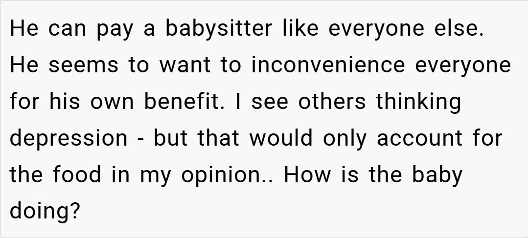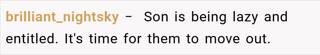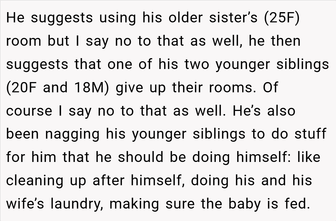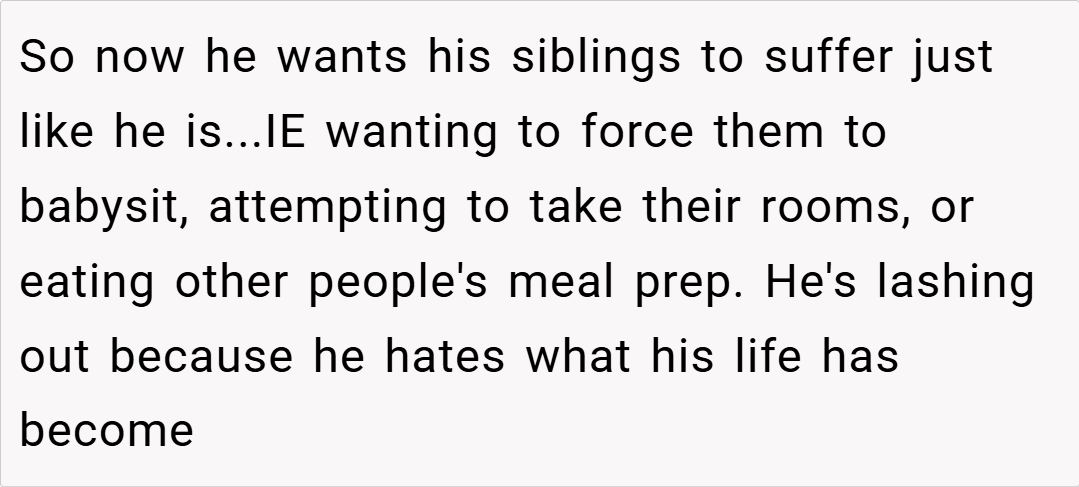 Initially, the son’s return was seen as a temporary measure while he found a permanent place to live, but his behavior has since spiraled into a series of boundary violations. From insisting that his wife sleep in inappropriate spaces to demanding that his younger siblings take on responsibilities like babysitting—and even eating all the prepared meals without replacing them—his actions have disrupted the delicate balance in the household.